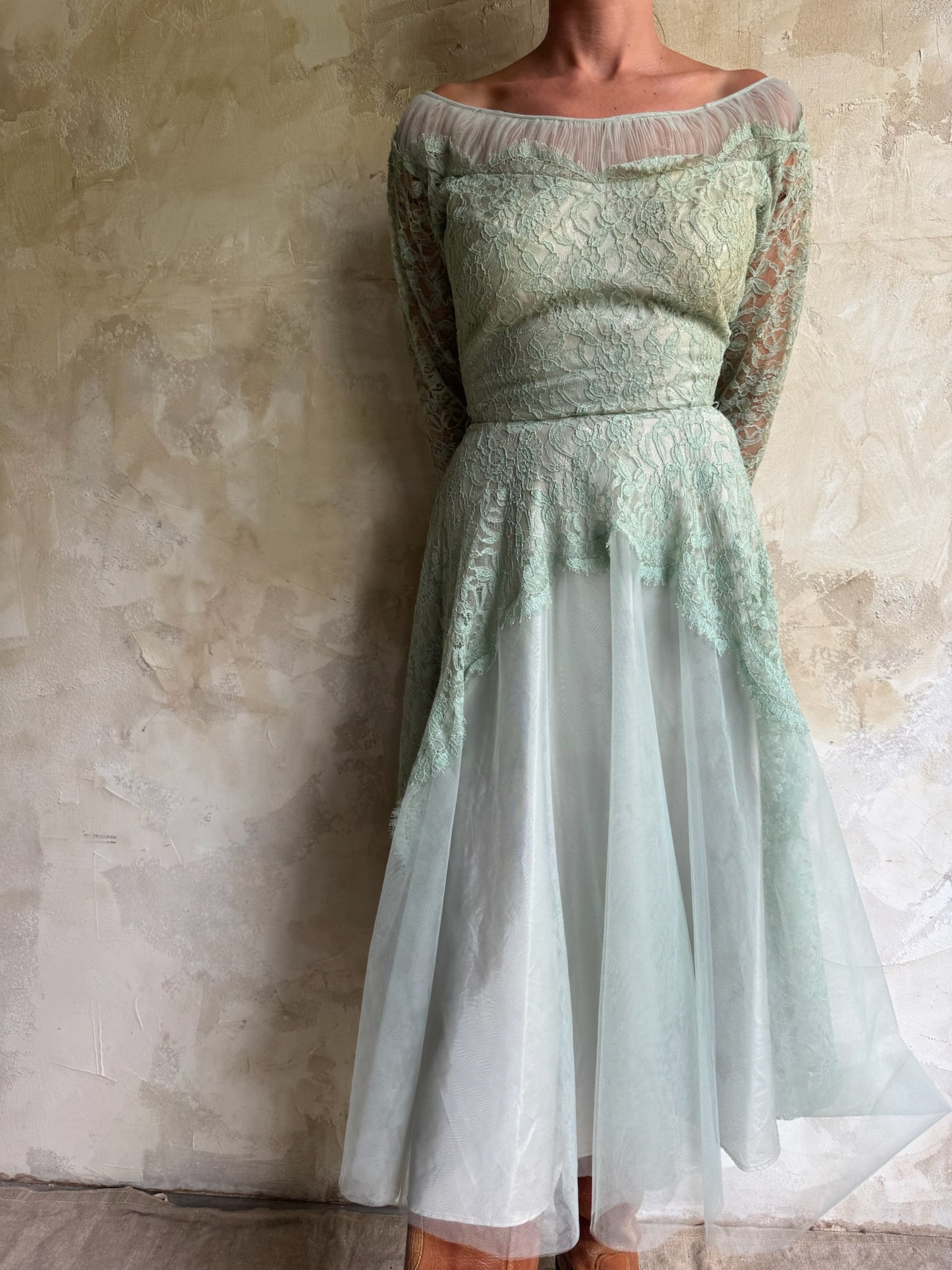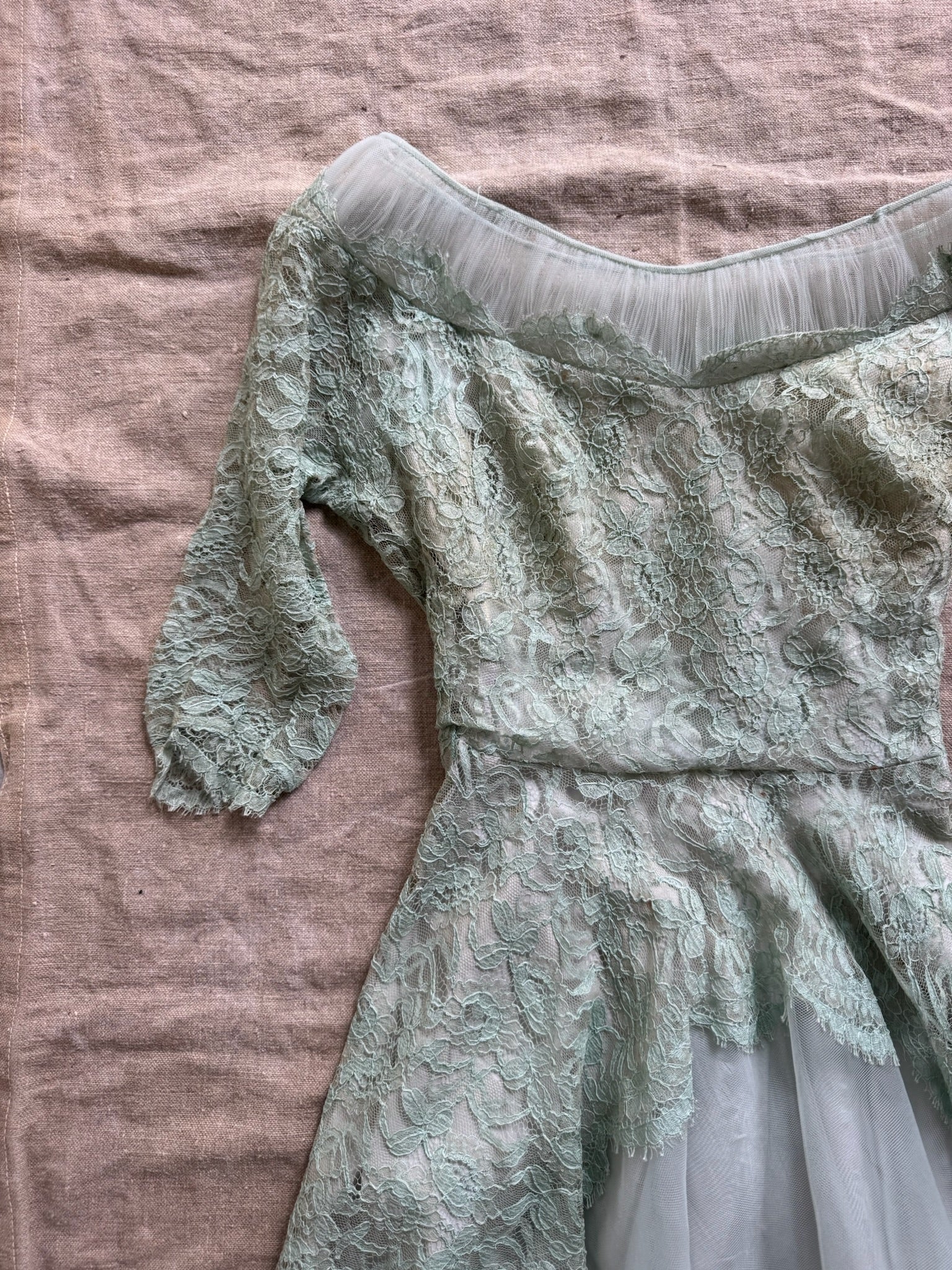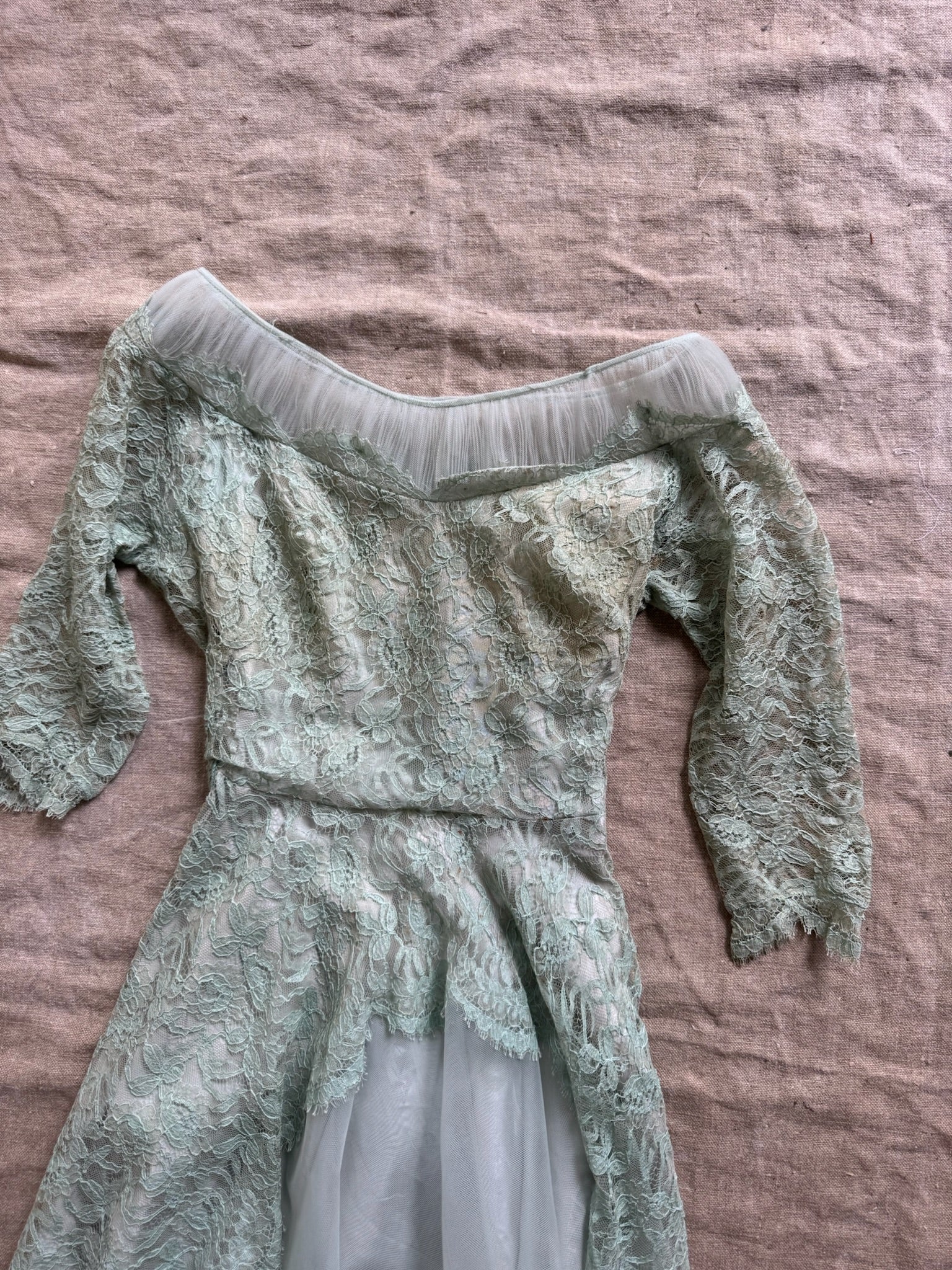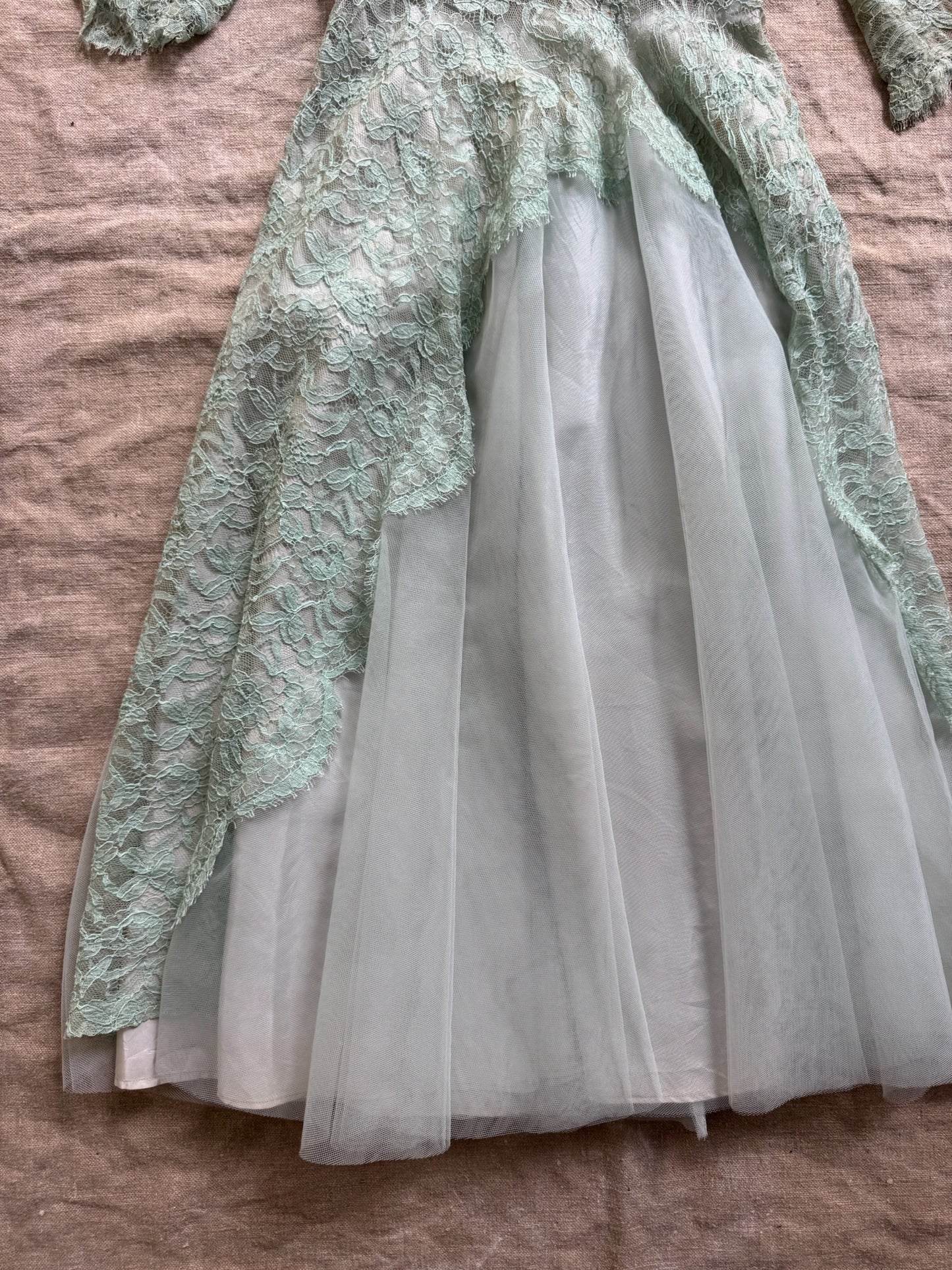 Seafoam tulle and lace long-sleeve party dress - stained lining and markings throughout.
