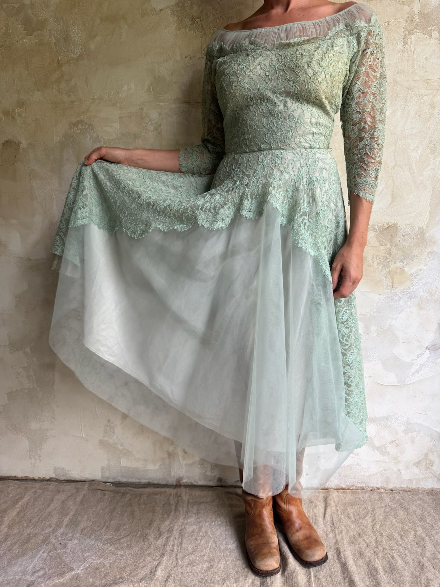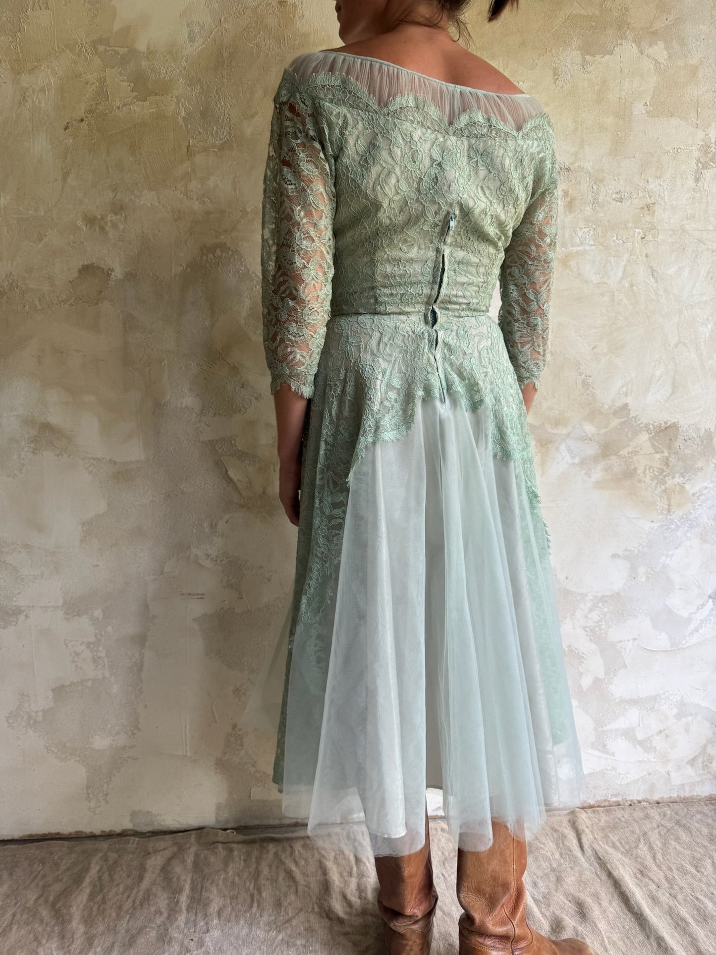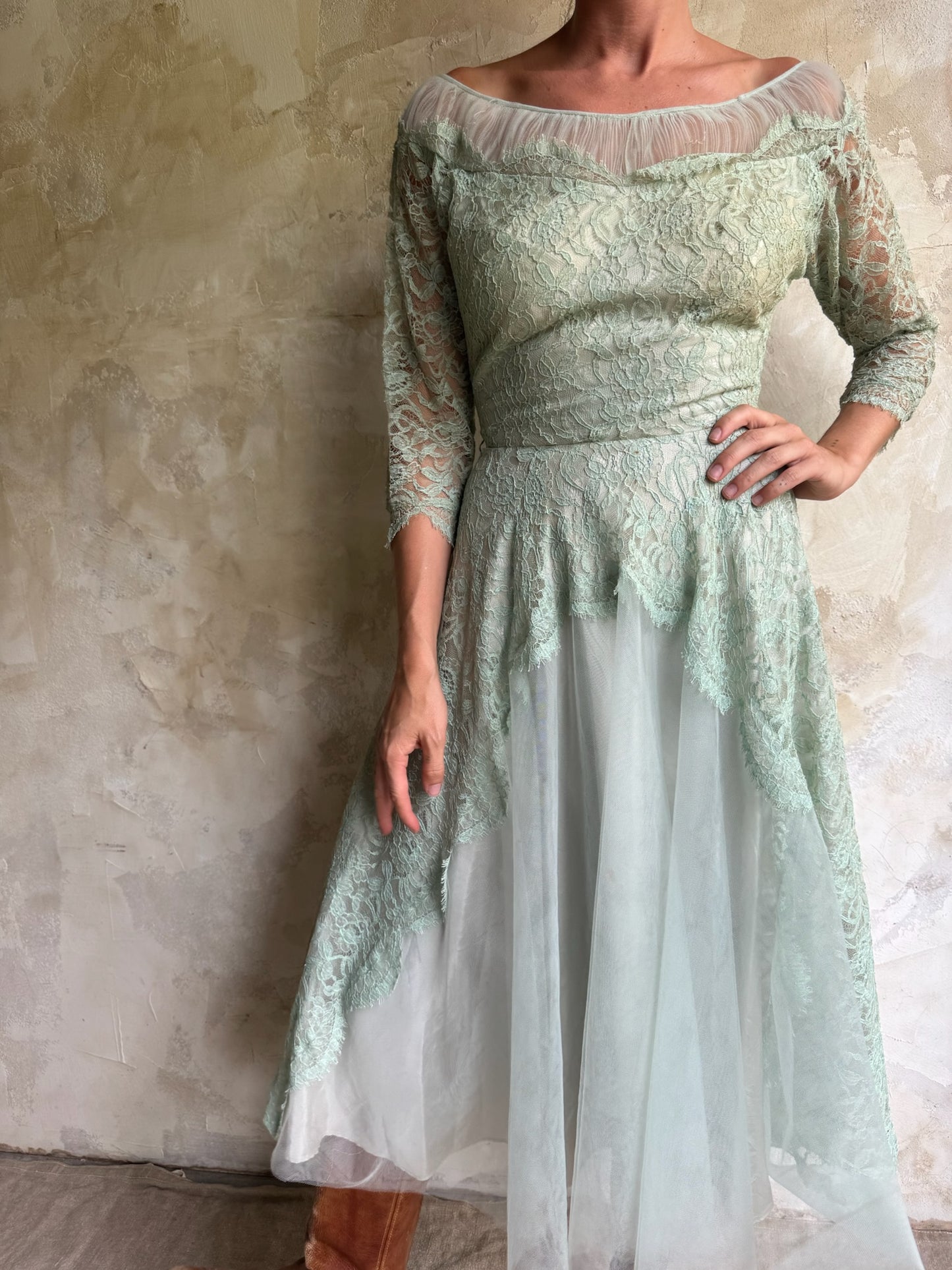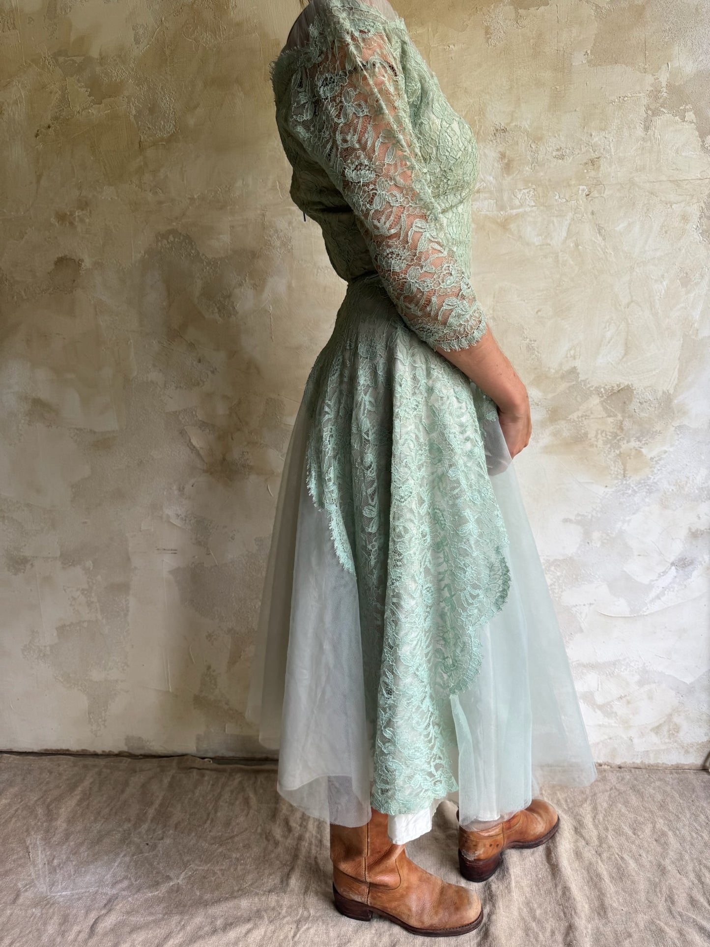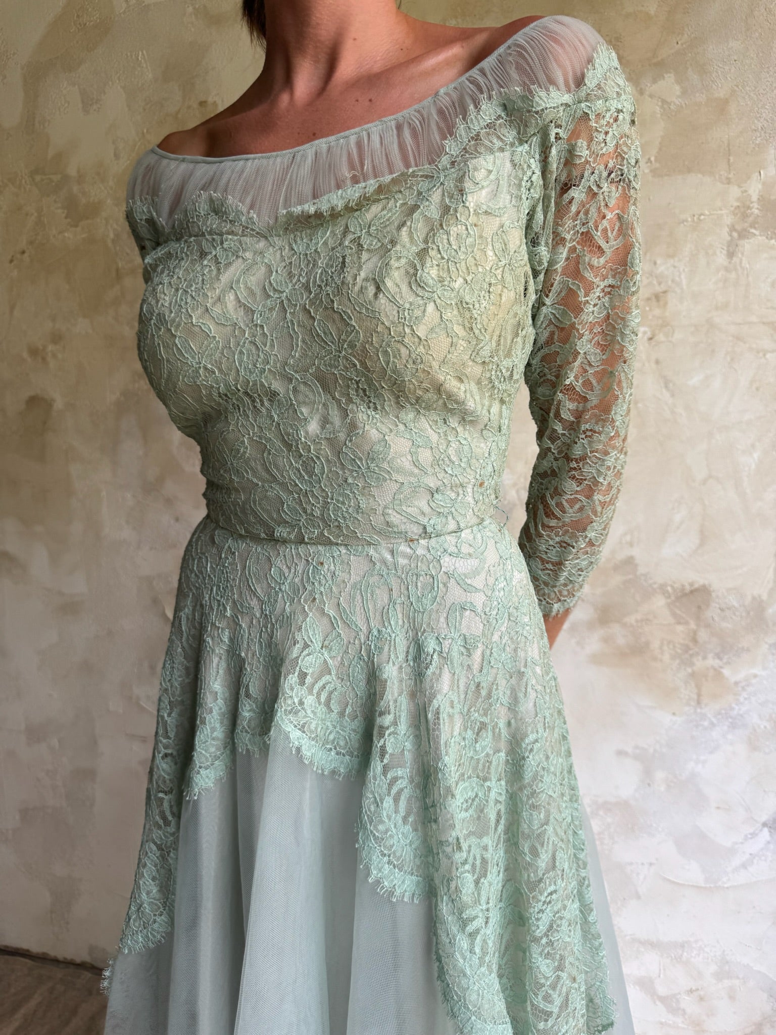 Seafoam tulle and lace long-sleeve party dress - stained lining and markings throughout.