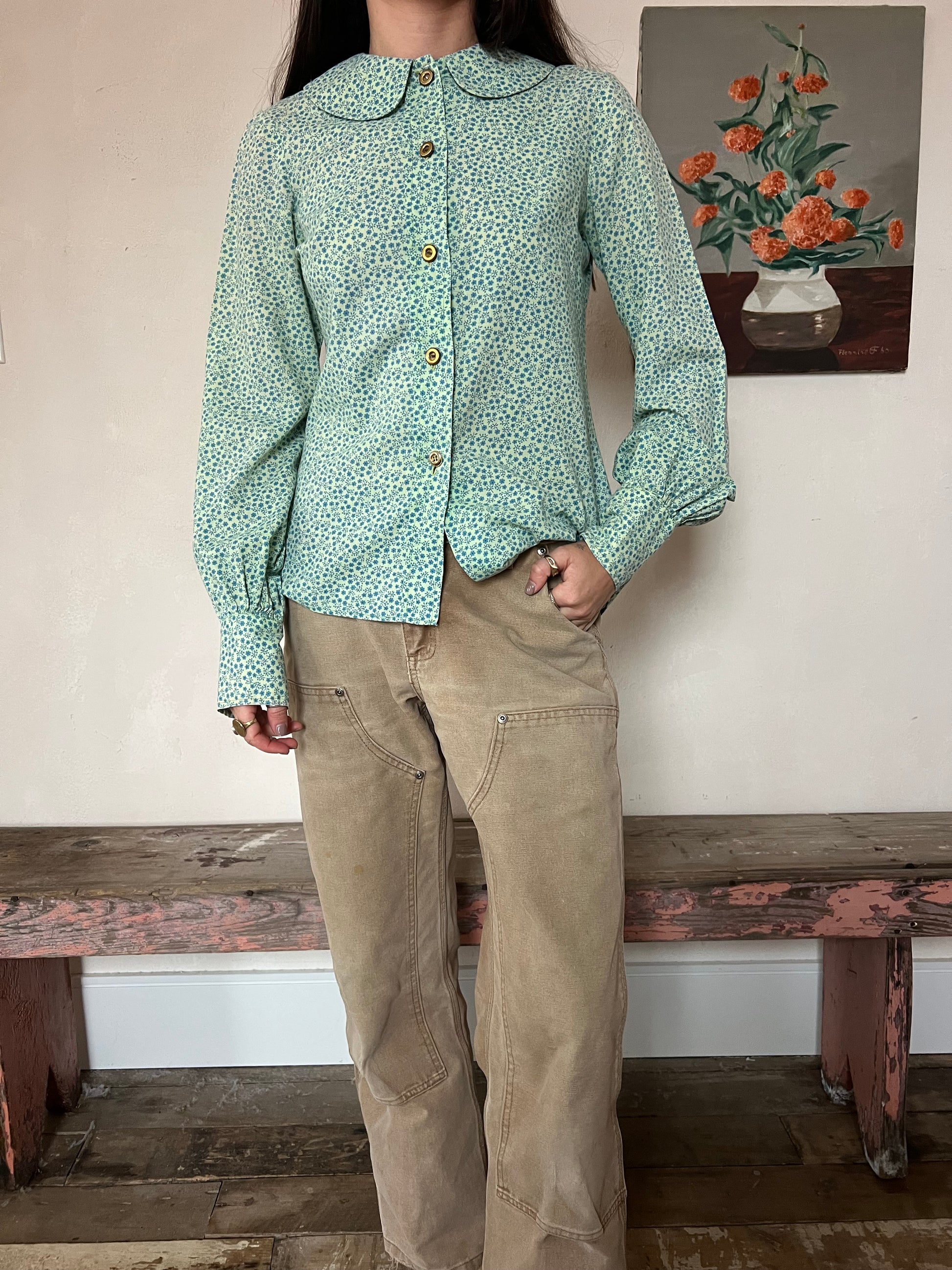 Missing buttons on the cuffs! No tags - handmade. Love the collar!