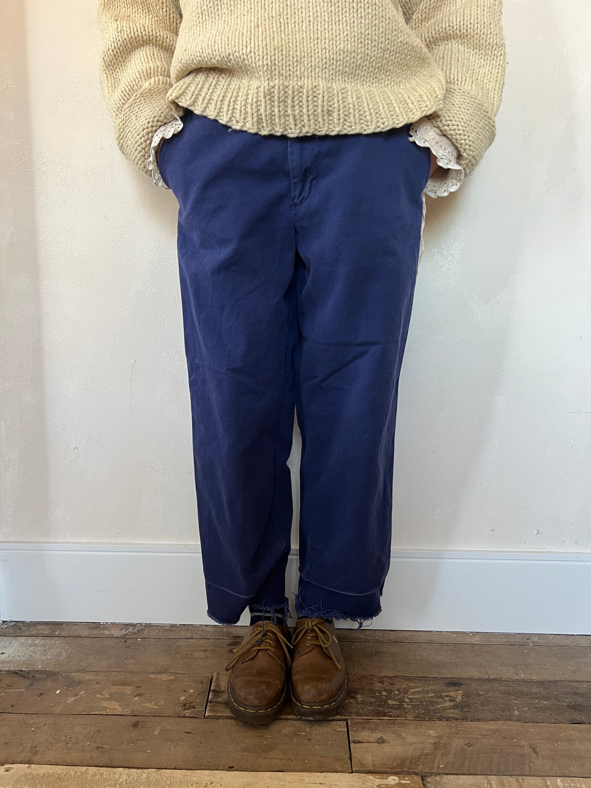 Indigo blue faded workwear trousers. Such a classic!! Love the fading, distressing and mending on these! Straight leg. Raw hem.