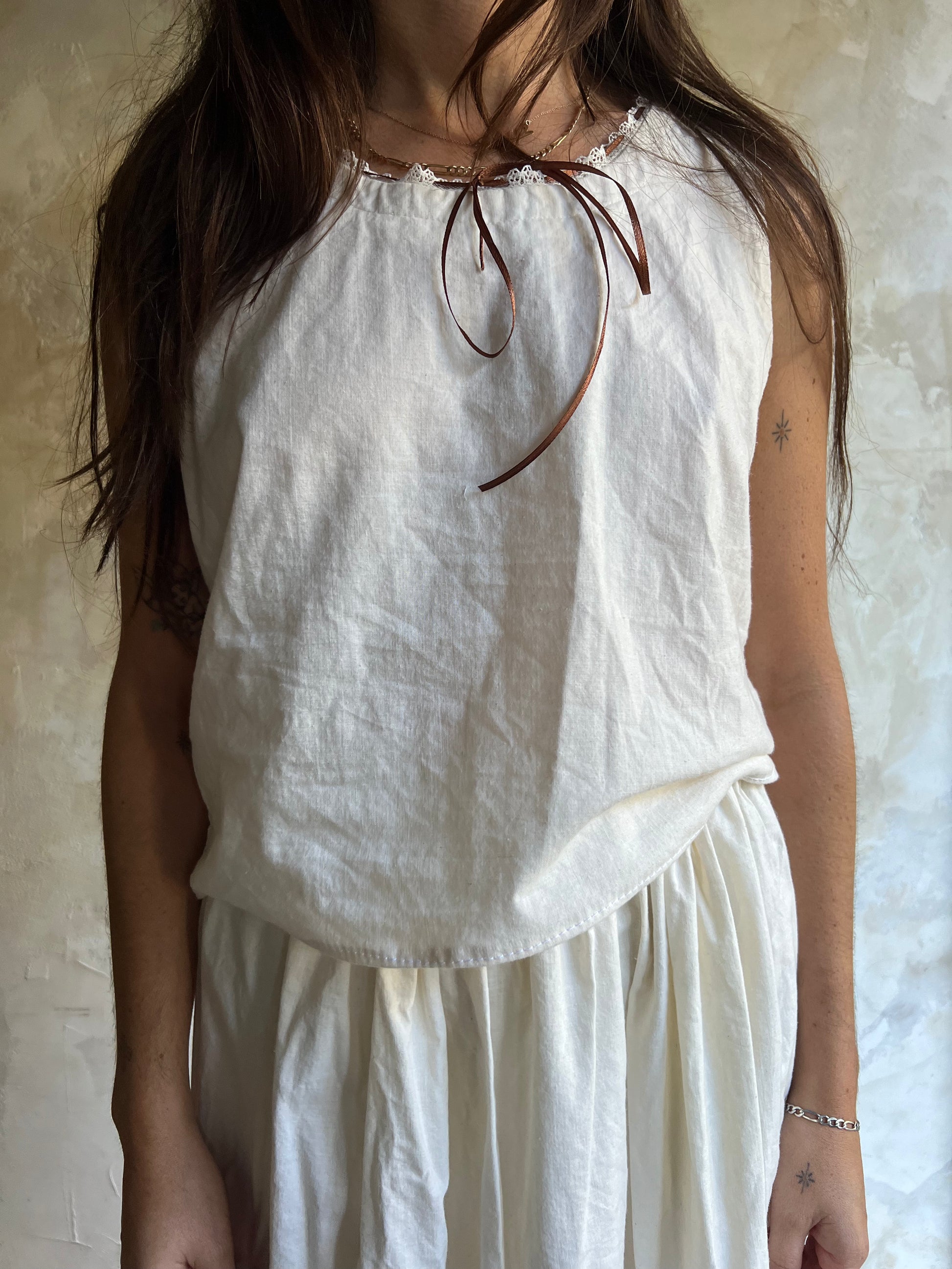 All handmade with natural cotton, crochet detailing along the neckline and woven through with a brown satin ribbon.