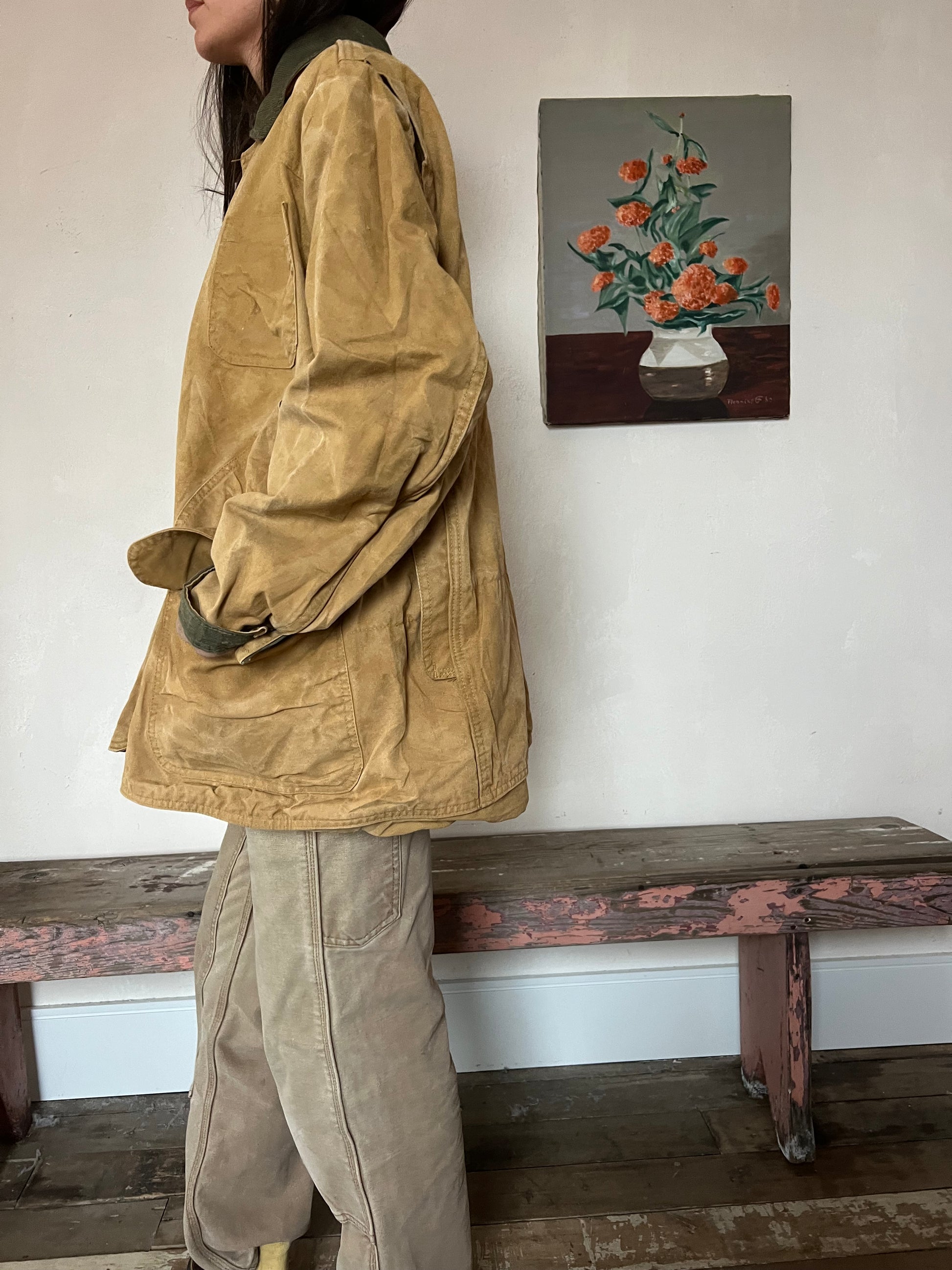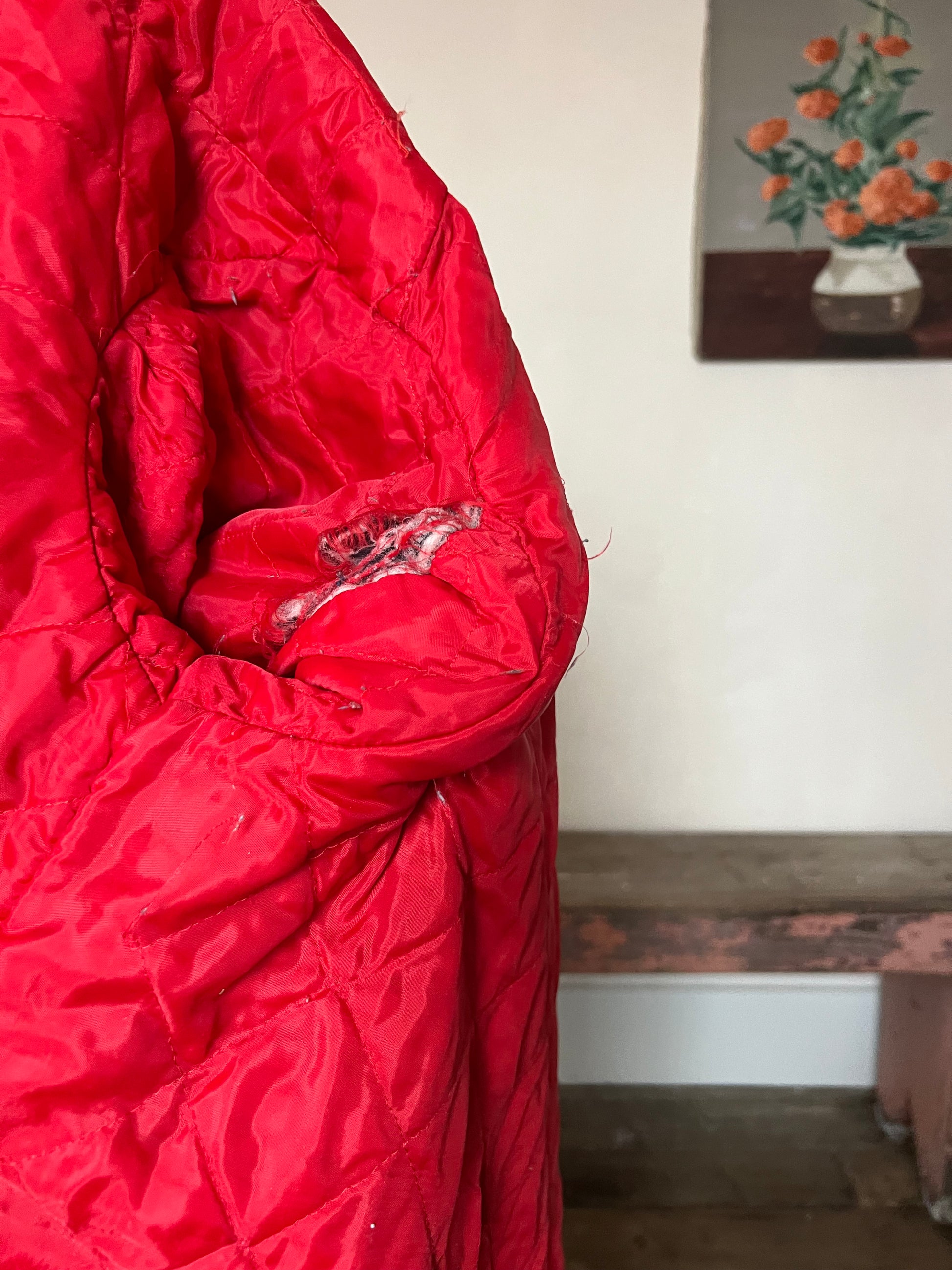 Green corduroy collar + cuffs. Has wear and a small hole in the back!