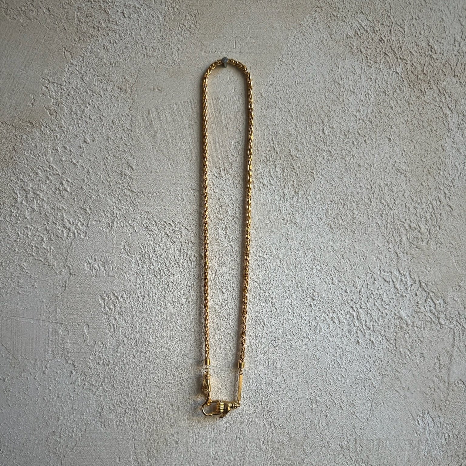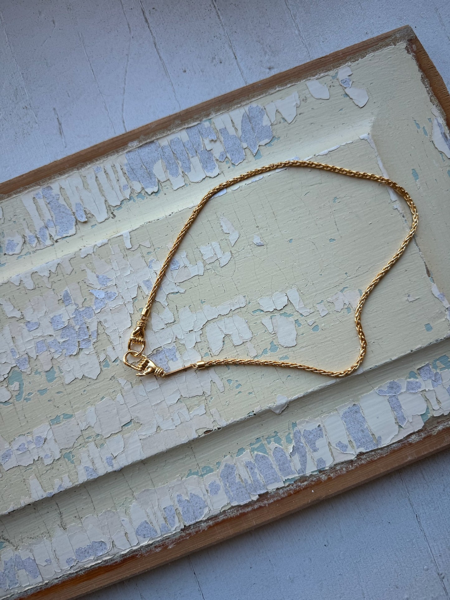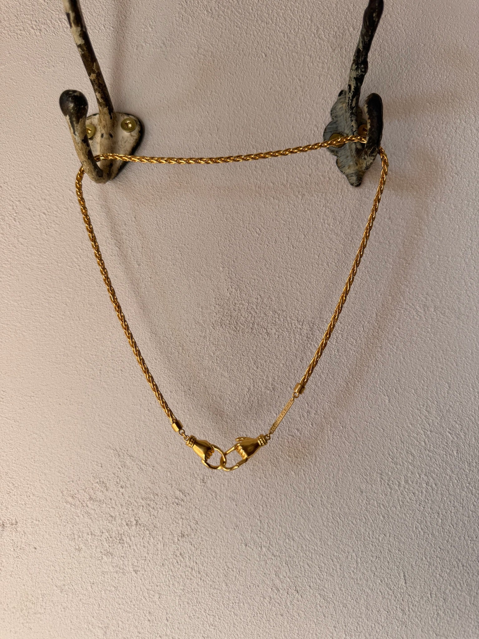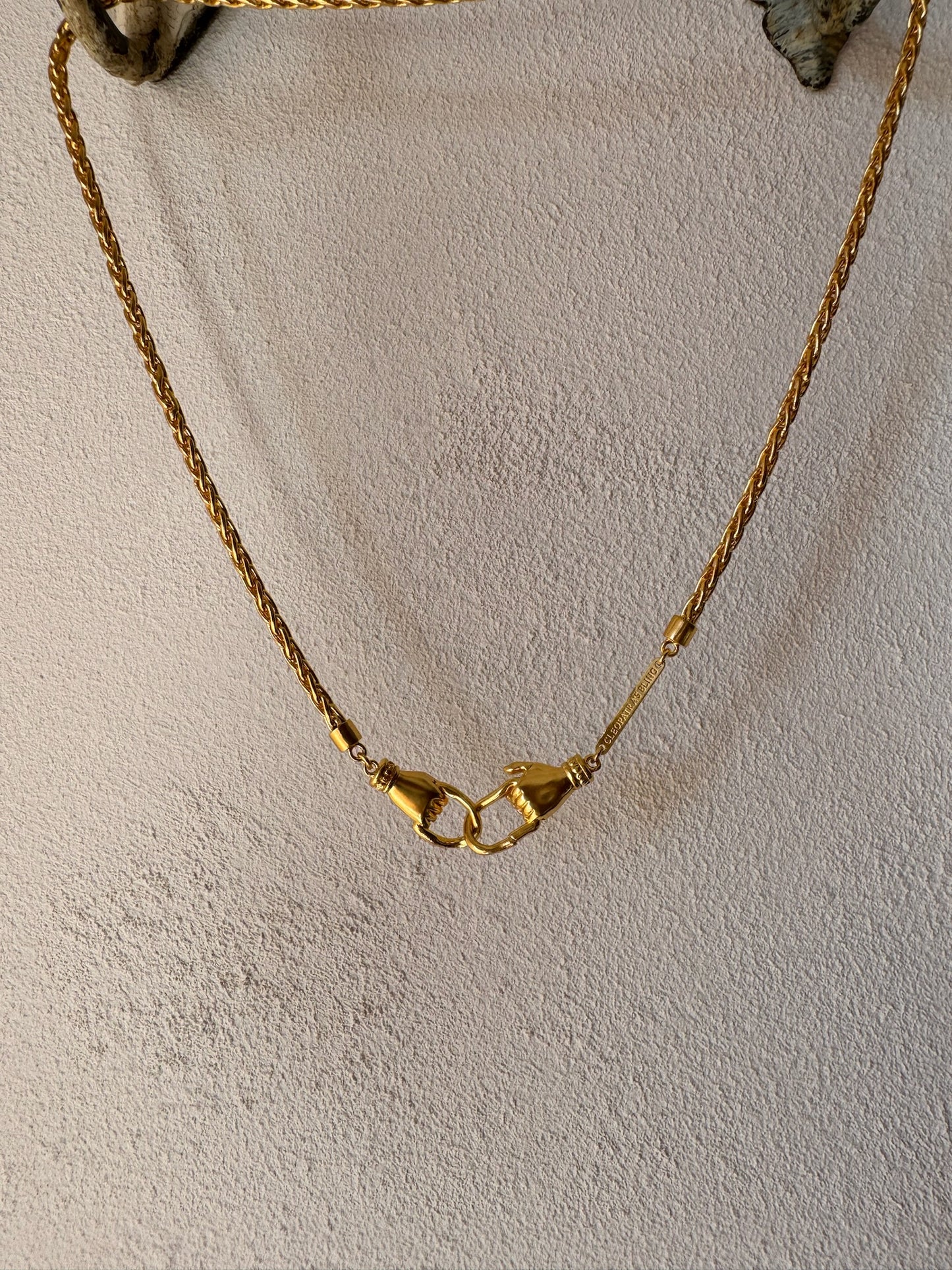 Handmade snake chain made in 1.5 micron of 18K Gold Plating over lead and nickel free bronze. The signature hand clasps can be worn at front or back.