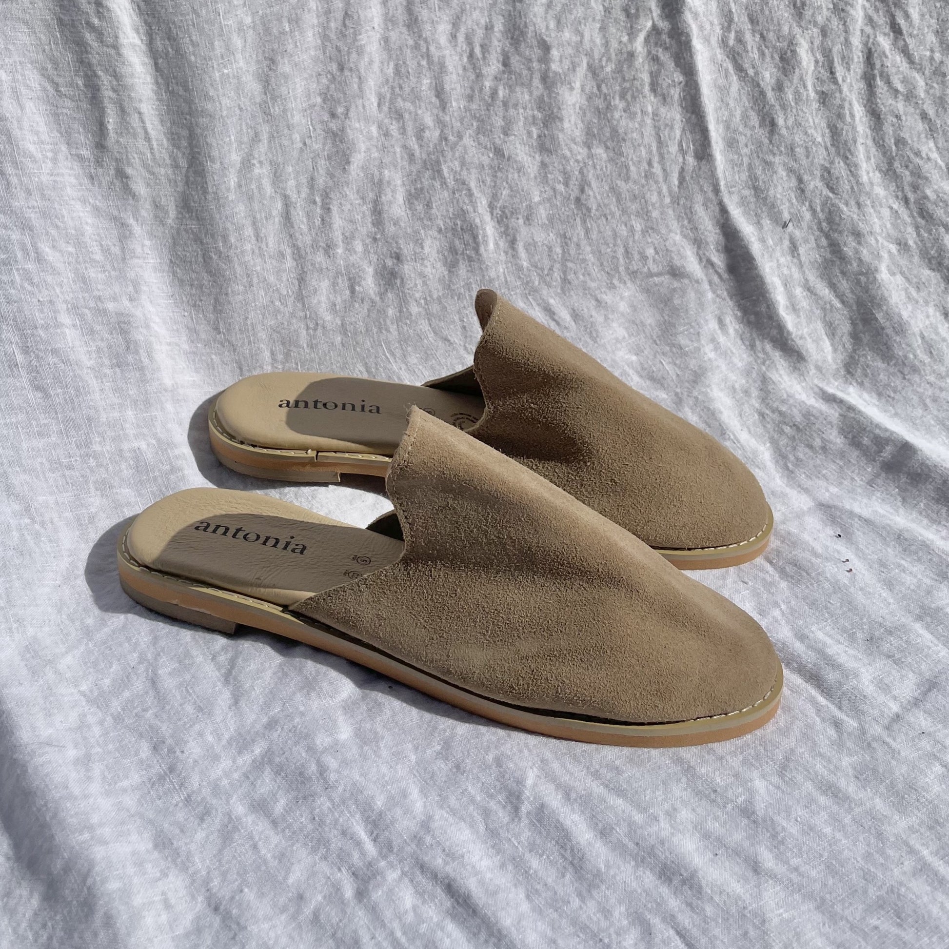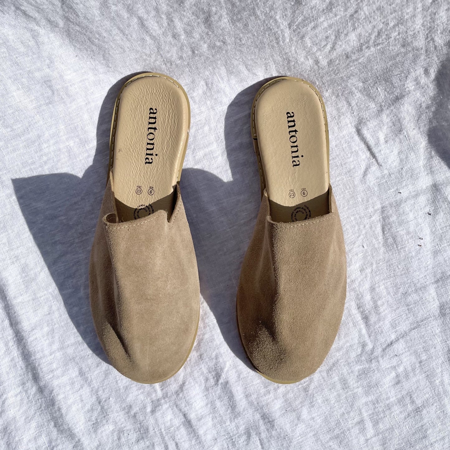 Elegant but very comfortable suede mules, handmade in a family workshop in Jalisco, Mexico. Soft suede leather upper with a cushioned footbed and rubber bottom, perfect for all-day walking.