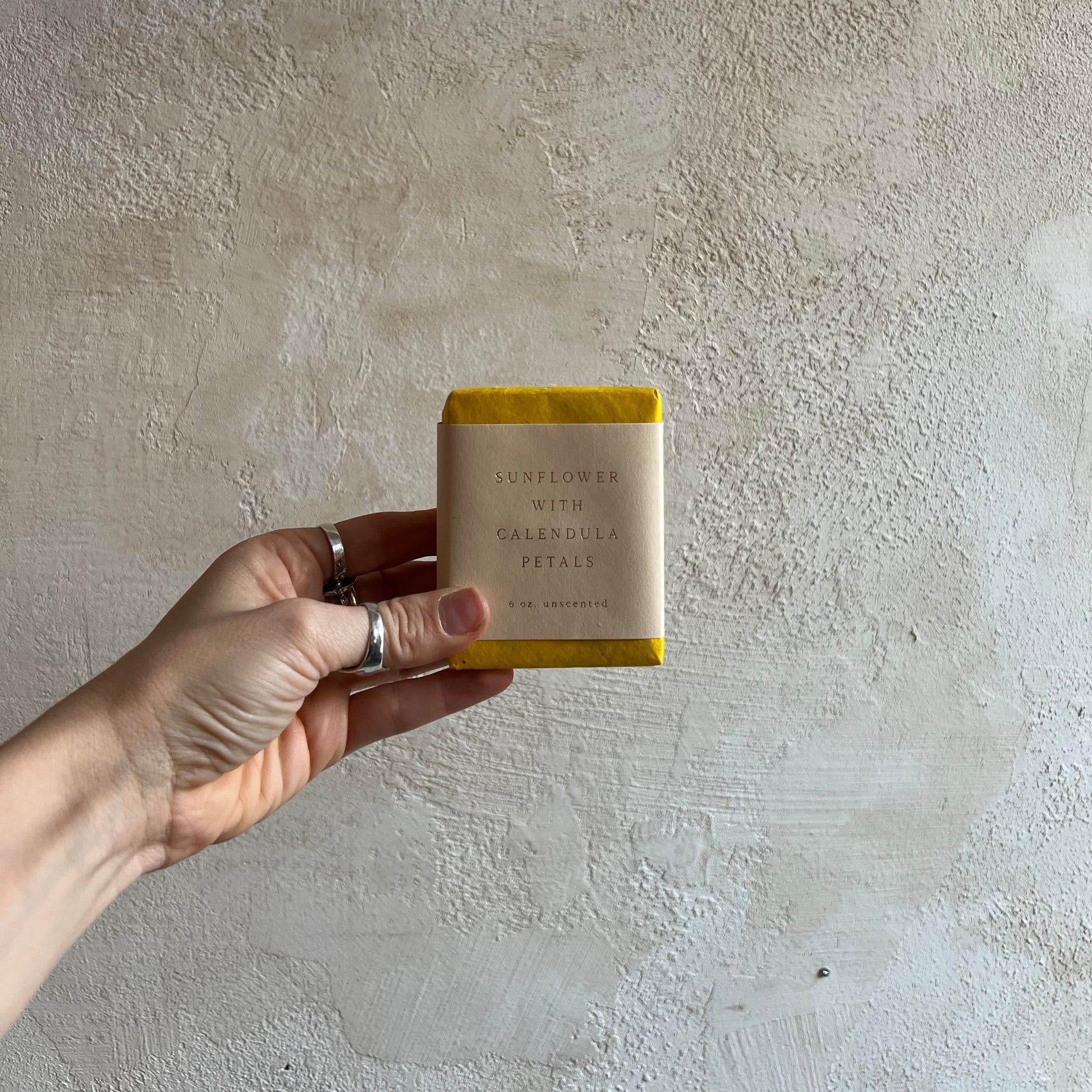 Contains saponified oils of olive, sunflower, coconut, and castor, with shea butter and ground calendula petals.