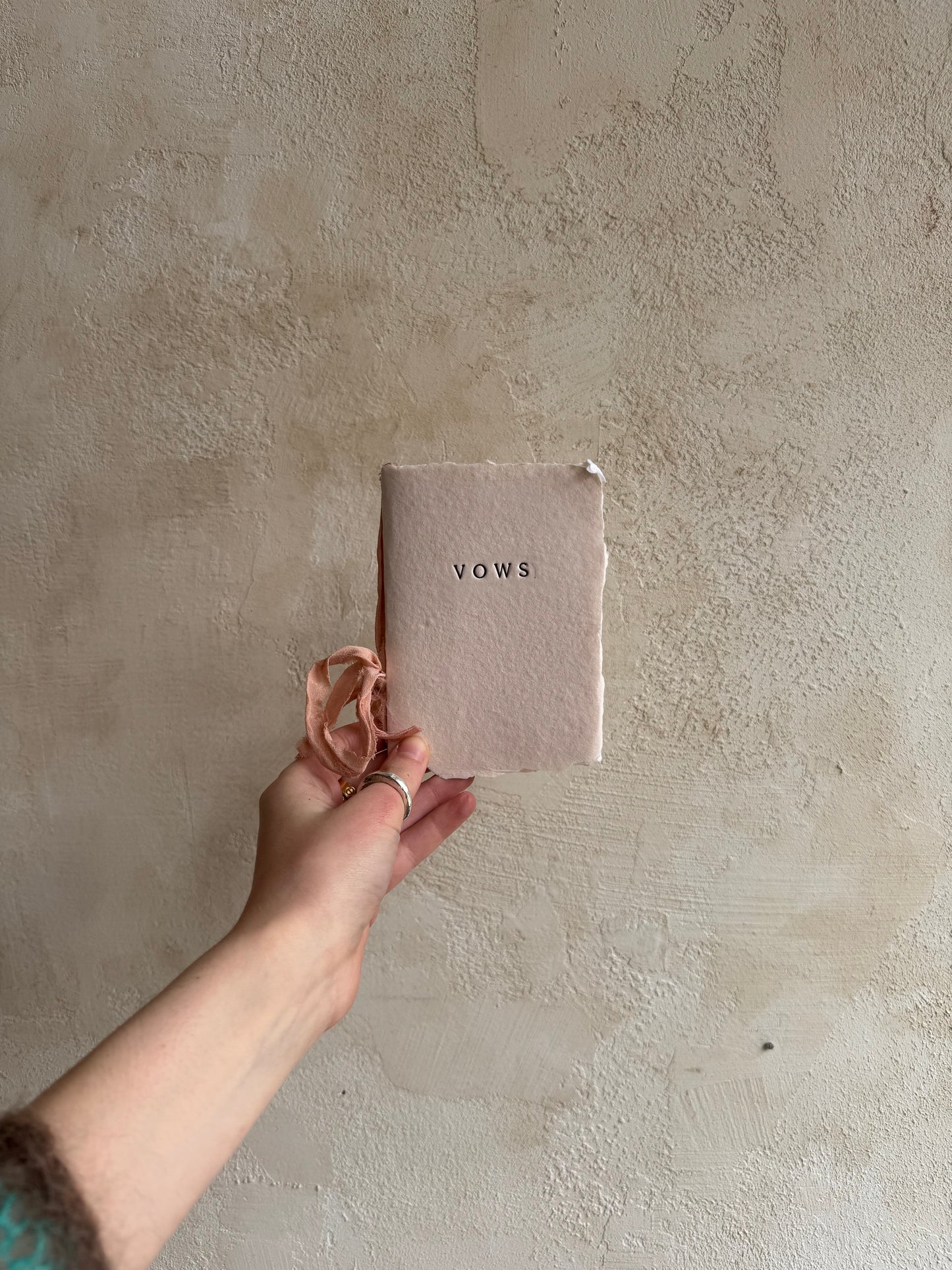 A beautiful token for your wedding day that lives on as a precious keepsake for the years to come. Each vow book is made in our California studio, with the cover paper and letterpress handmade by us and the twelve interior pages made by artisans in India. Tied with 100% silk ribbon sewn in India and botanically-dyed in our California studio. Approximately 5.25x3.75in. Interior pages are white.