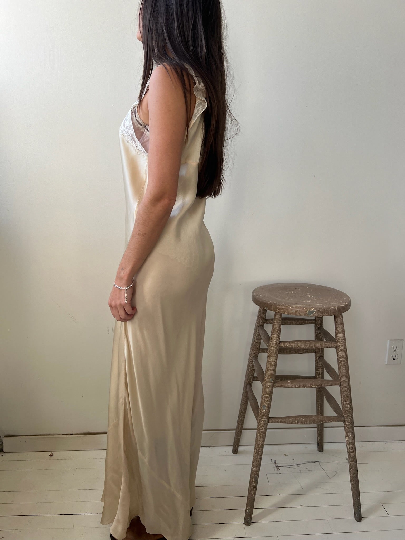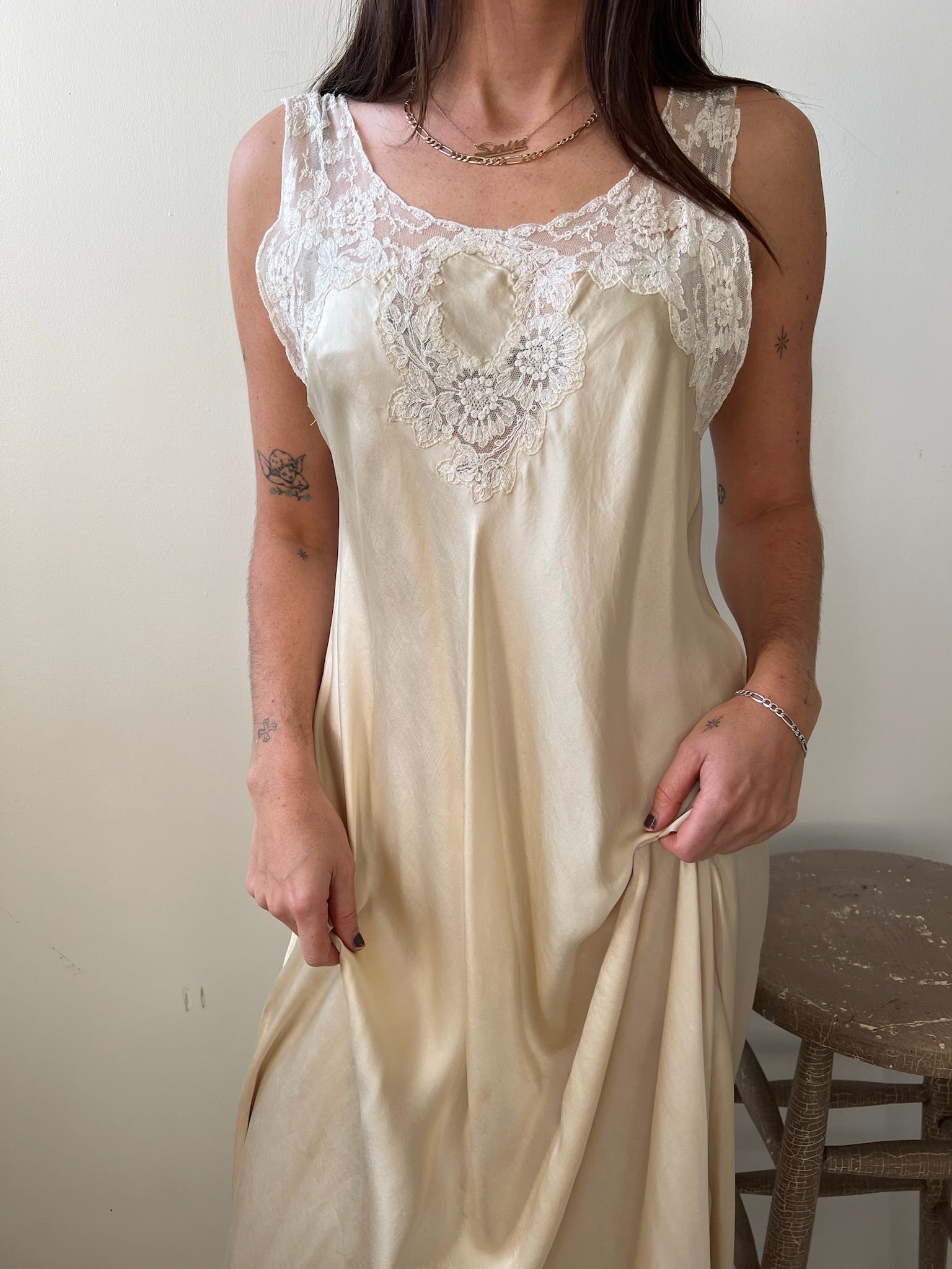 Beautifully butter soft silk!!! Such beautiful lace! Some minor tear through the lace.