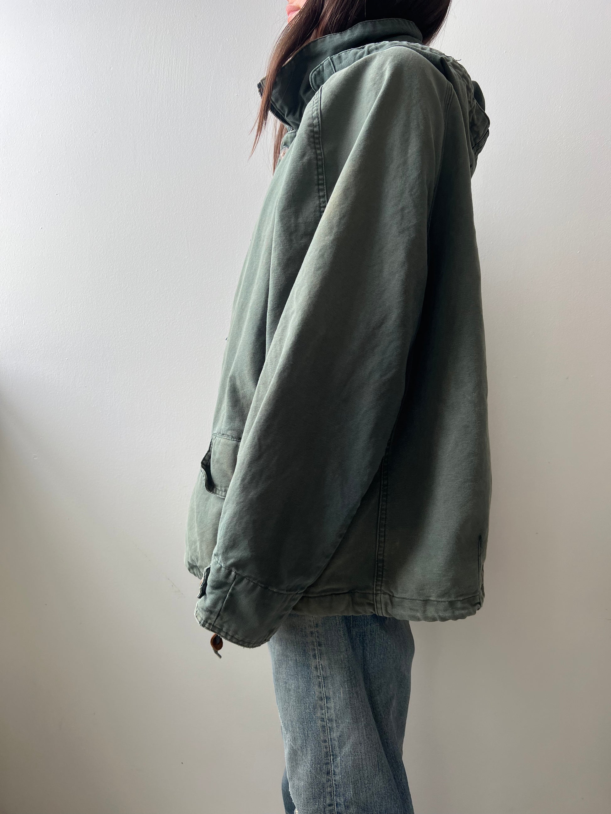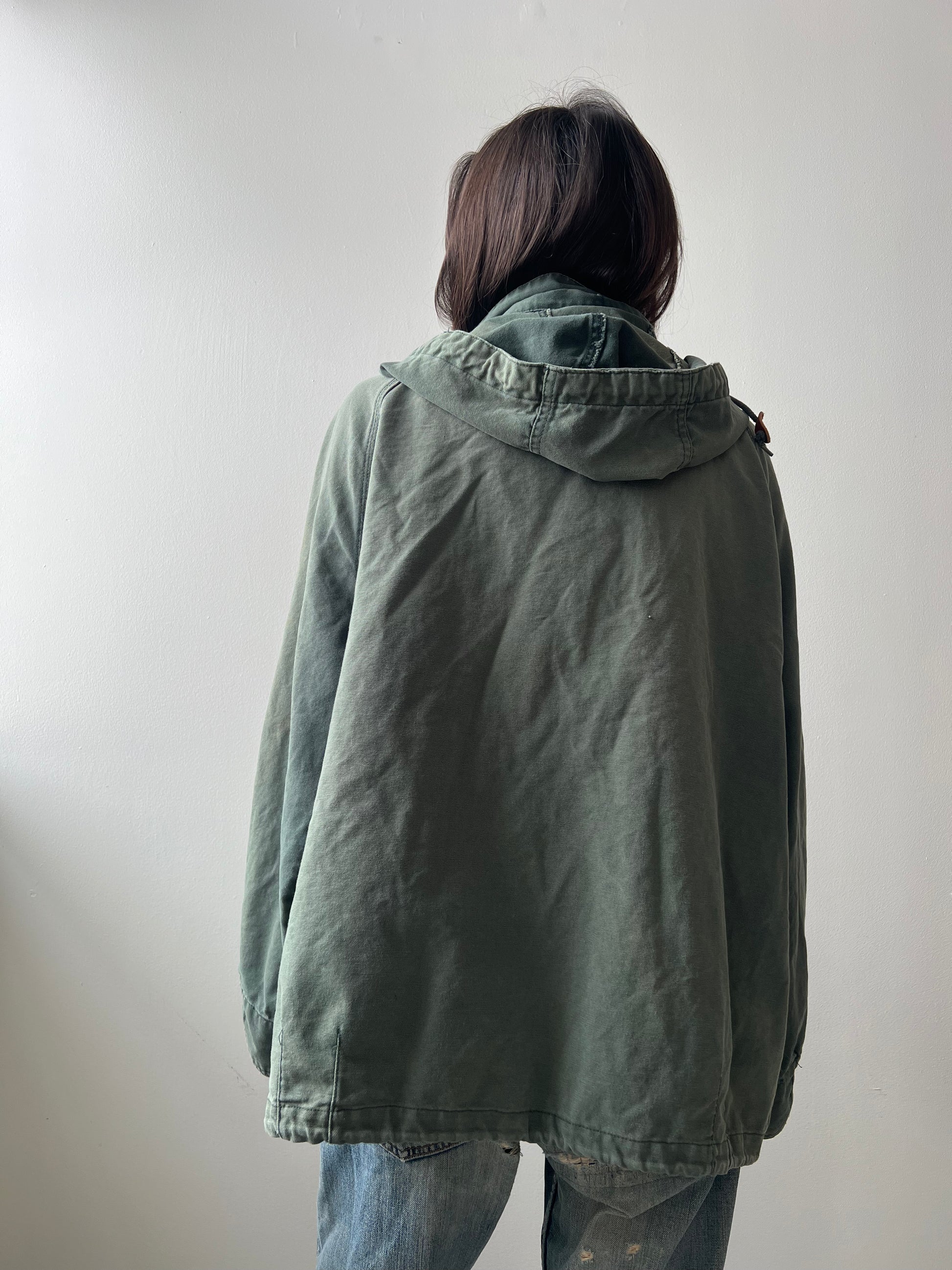 Removable hood. 100% Cotton. Missing one button - but also has zipper closure!