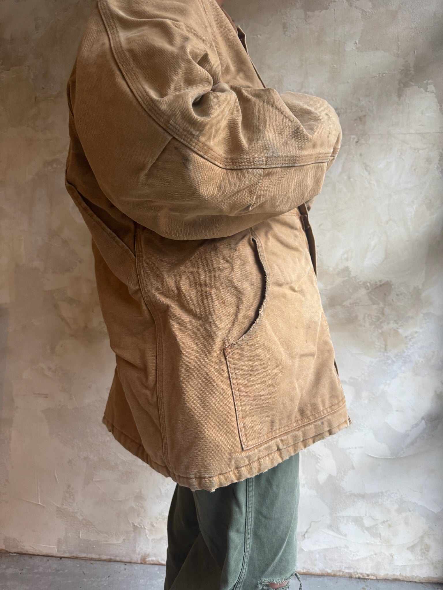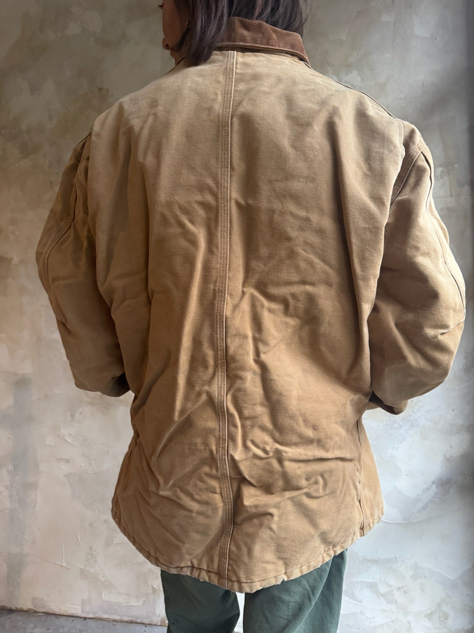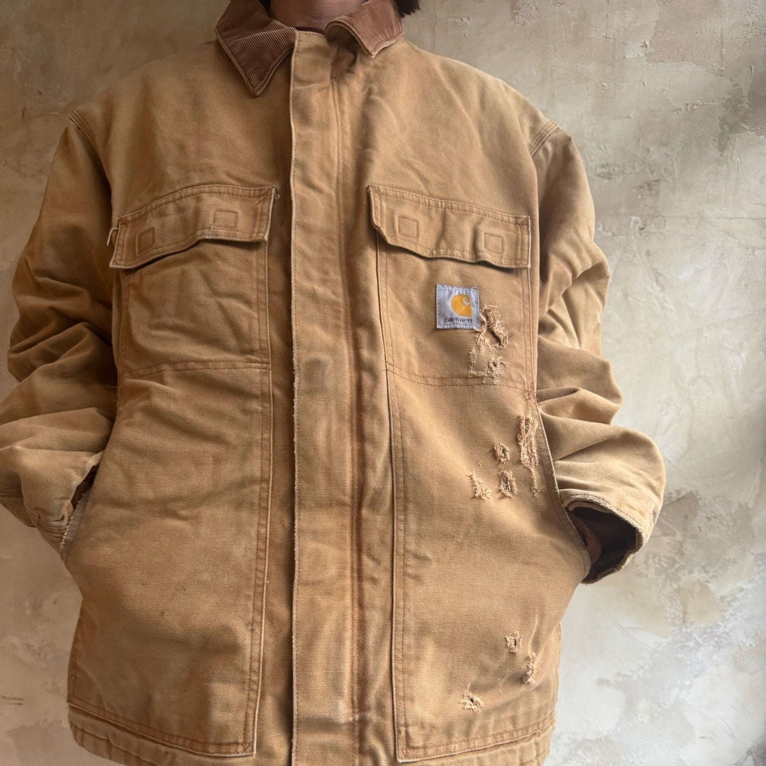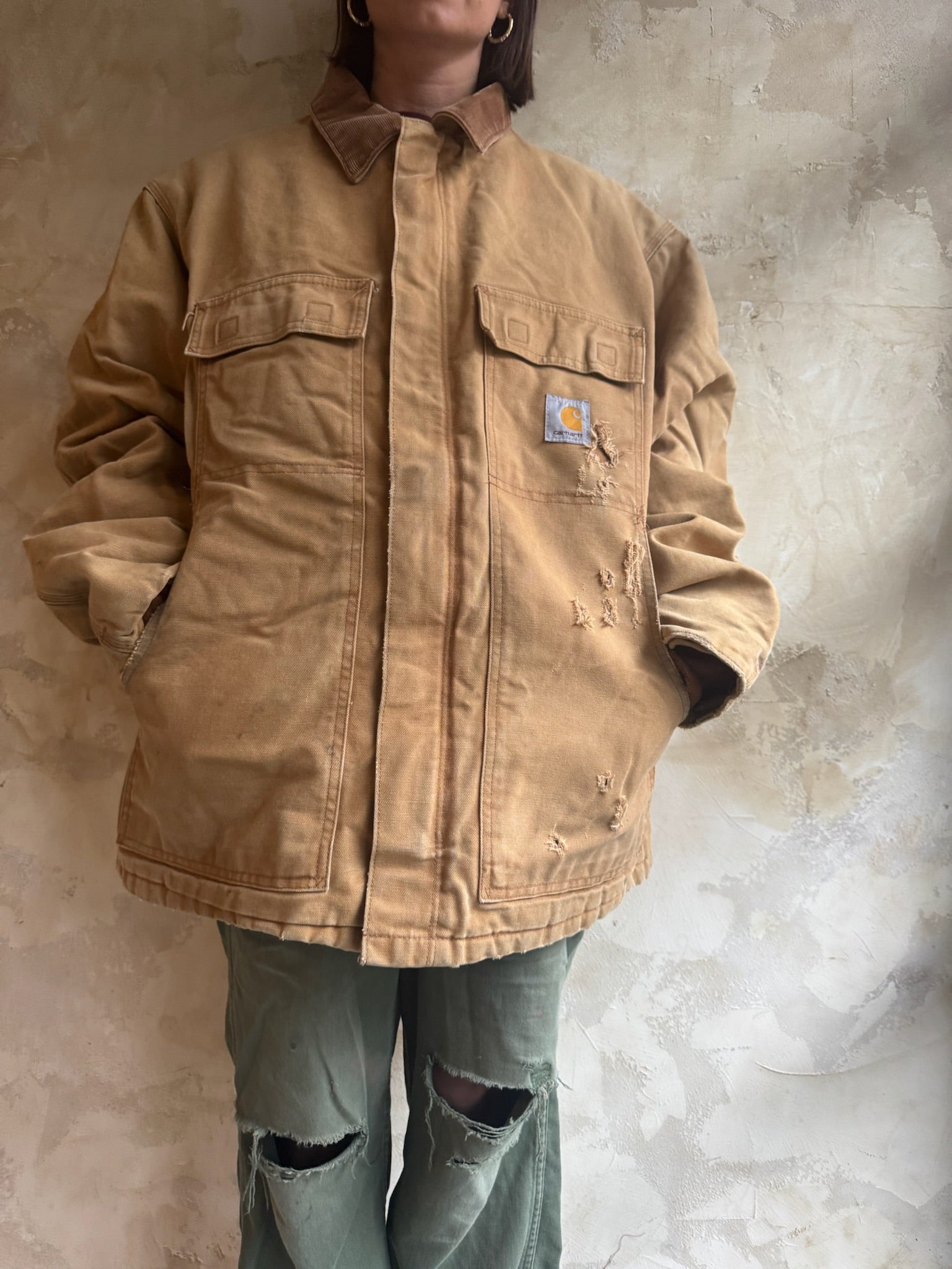 Classic Carhartt chore- zipper and velcro closure- markings throughout.
