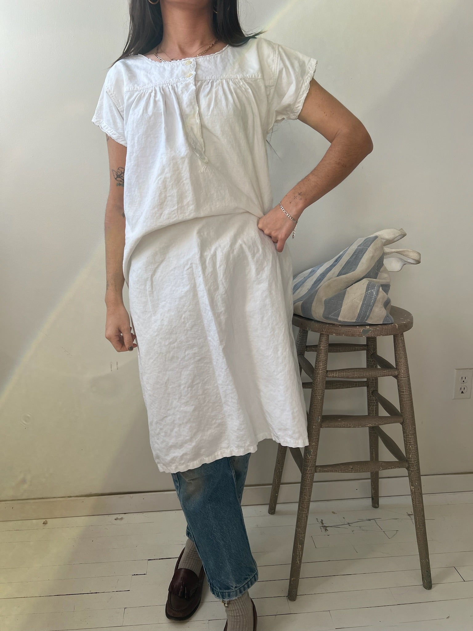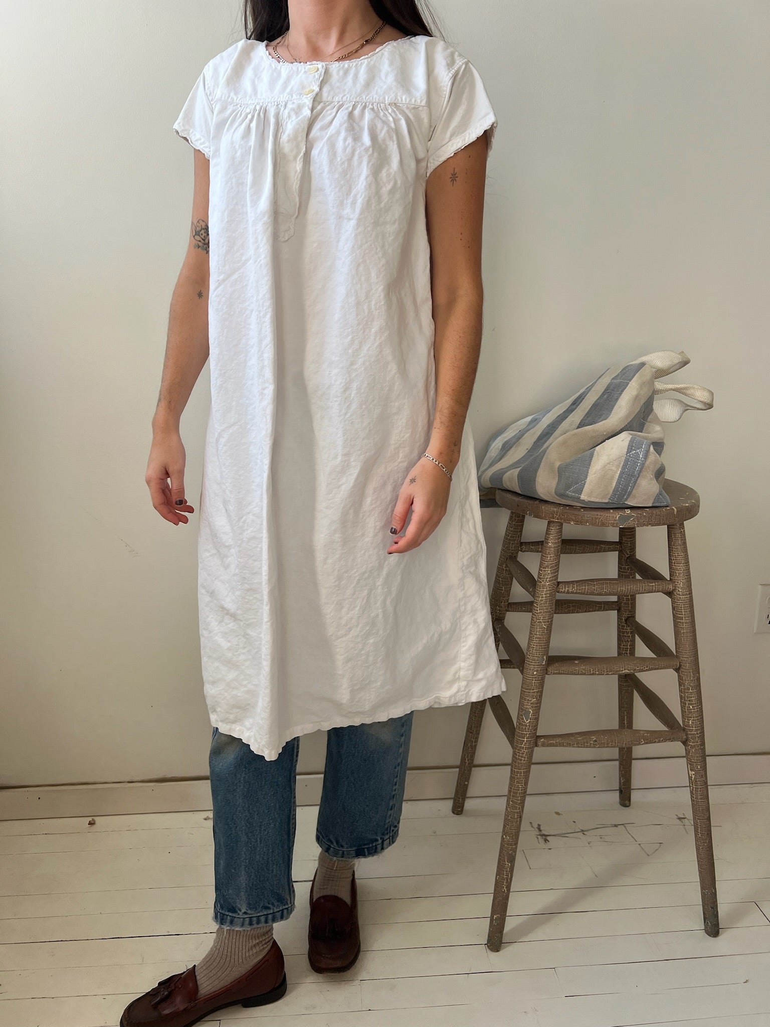 Linen short sleeve smock with a small crochet trim.