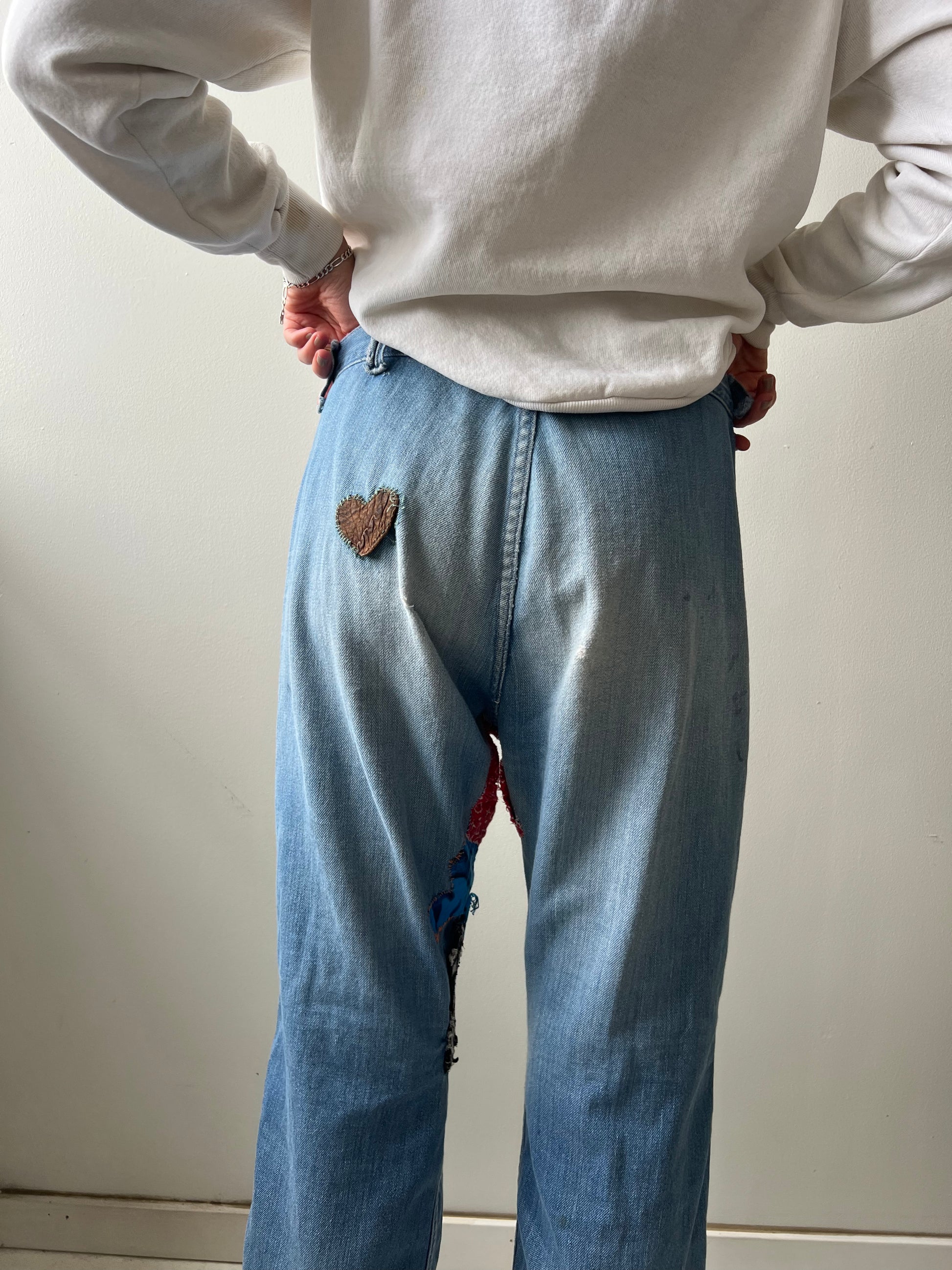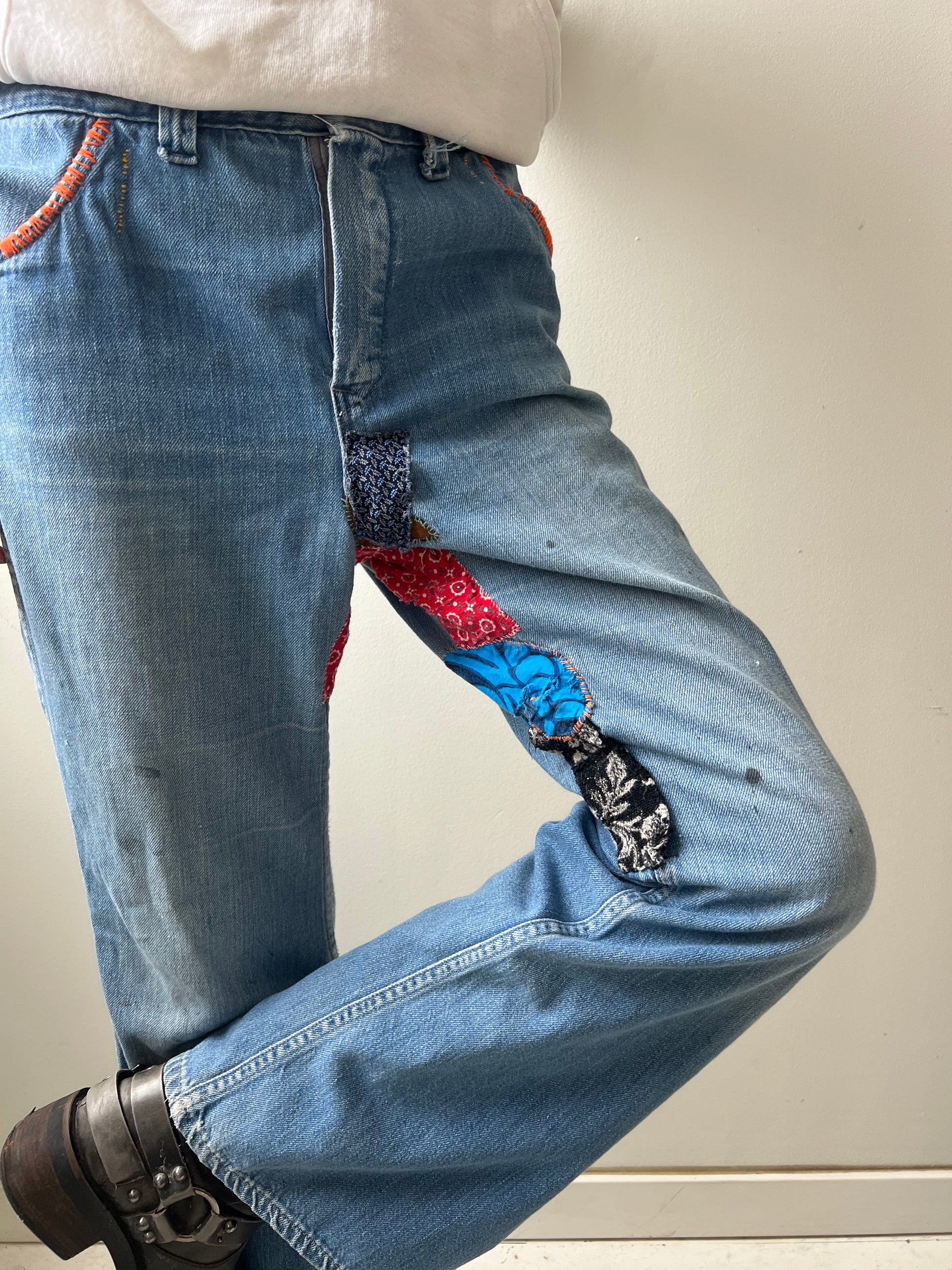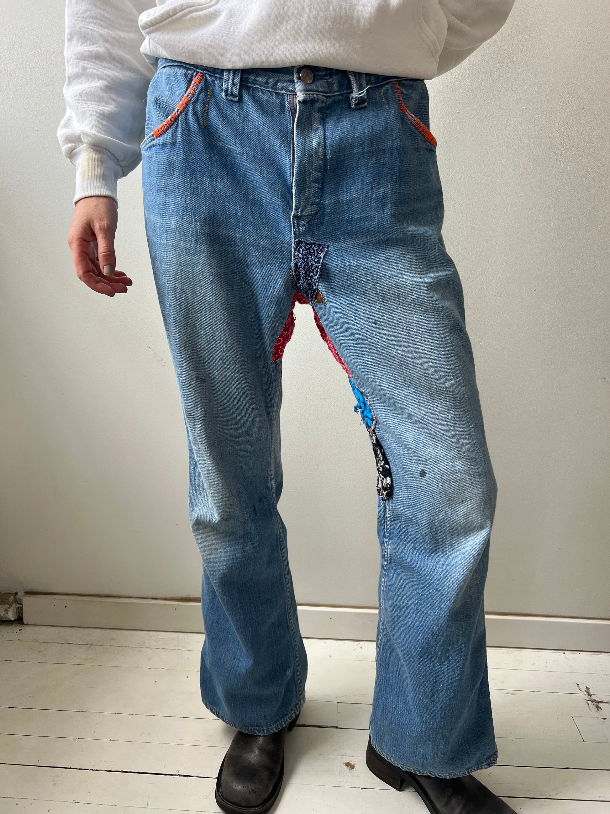 Flare with mending and embroidery throughout. Missing belt loops. Thinning in the denim.