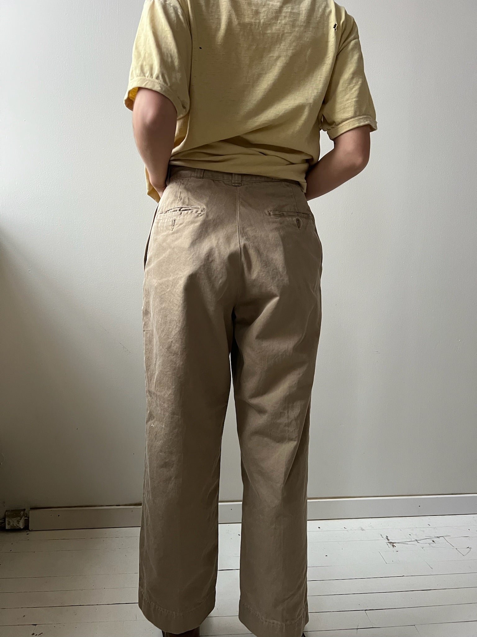 Trousers have a button up fly. Highwaisted/wide leg style. Markings are present and the legs have been cropped/tailored.