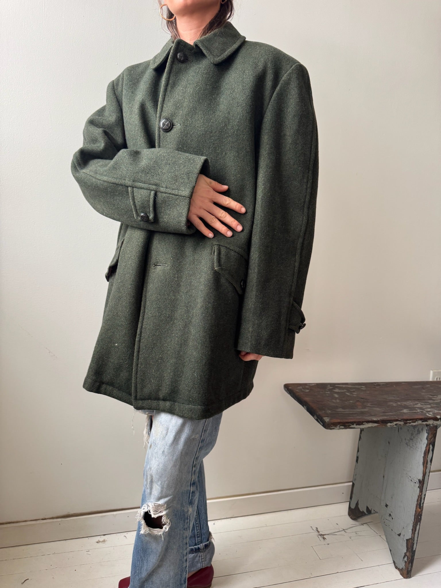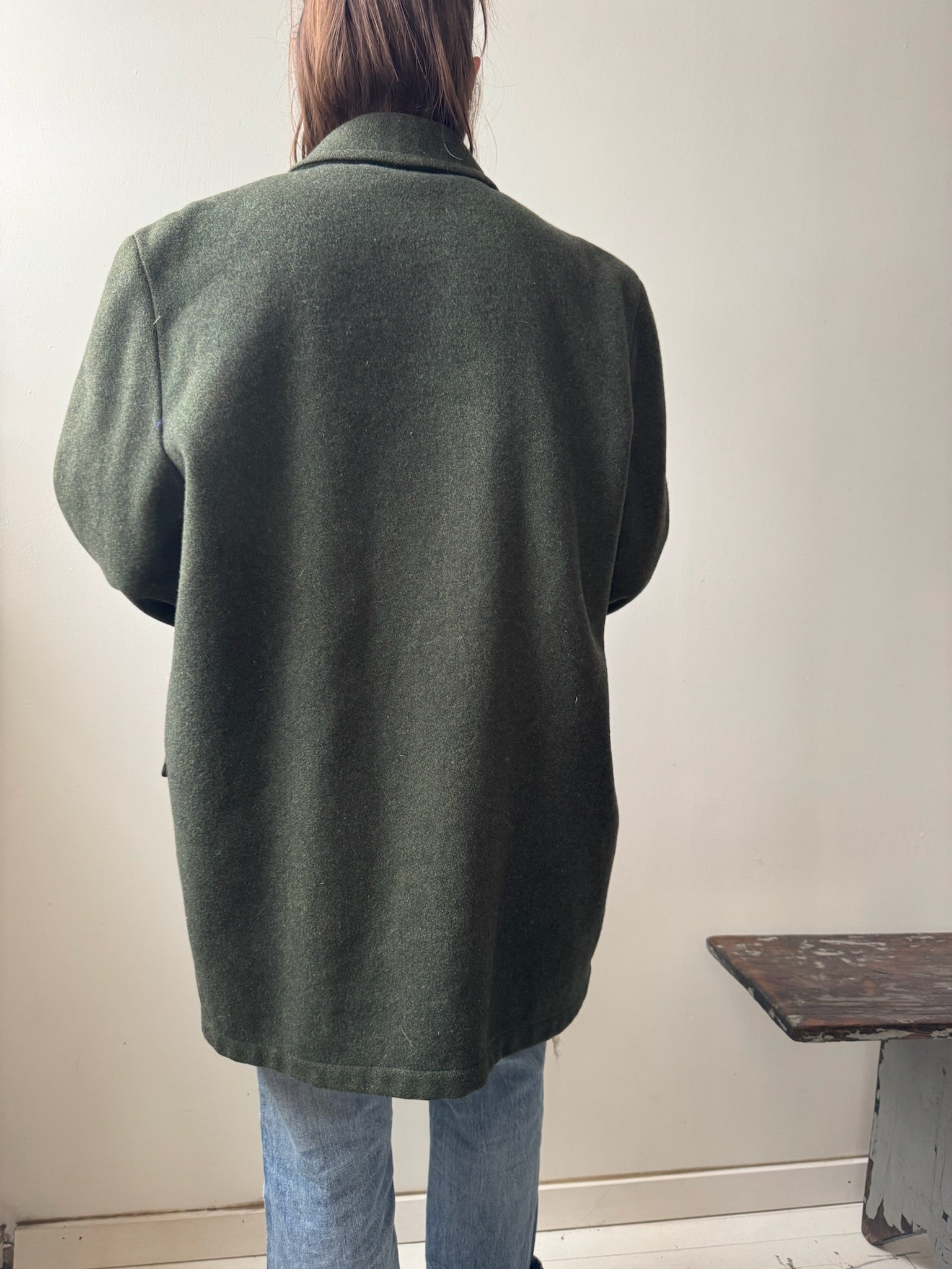 Coat has a wool exterior and faux shearling liner. * missing bottom button!