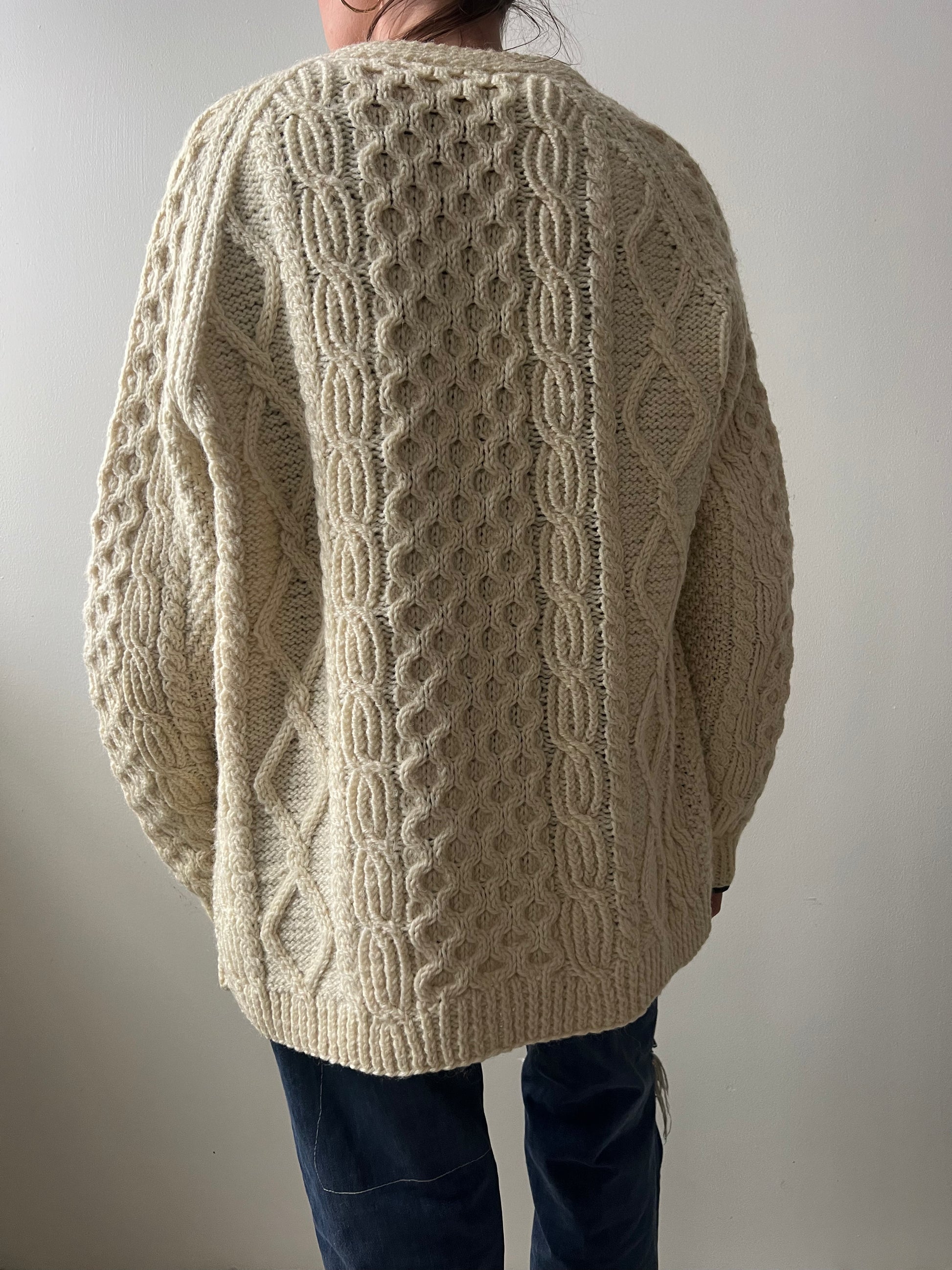 Traditional Irish hand-knit! Cardigan is 100% wool, and has markings present throughout.