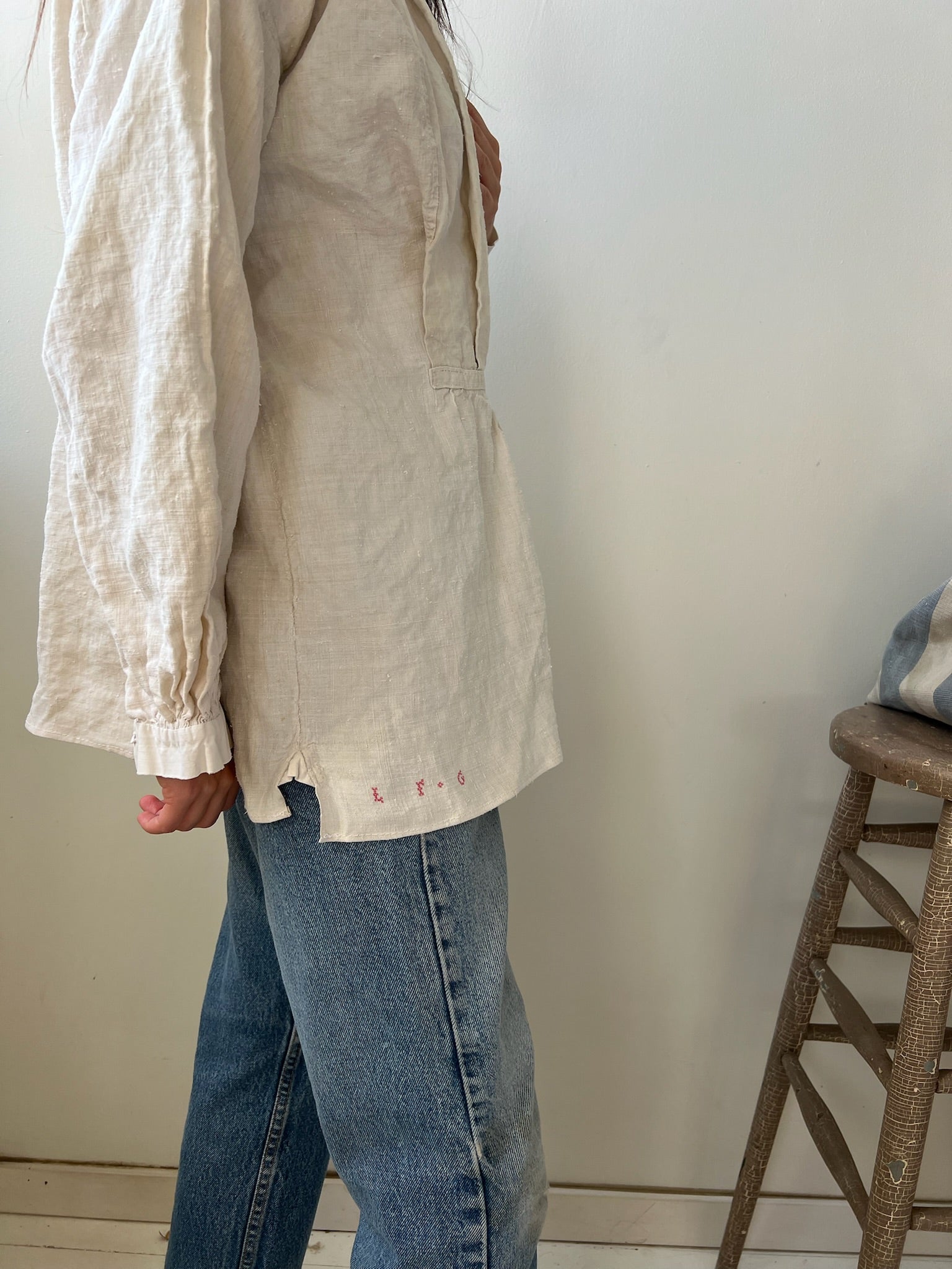 Off-White tunic style linen blouse with white collar. Embroidered initials along the hem - “L F G”. This top was reworked from a long dress to a blouse.