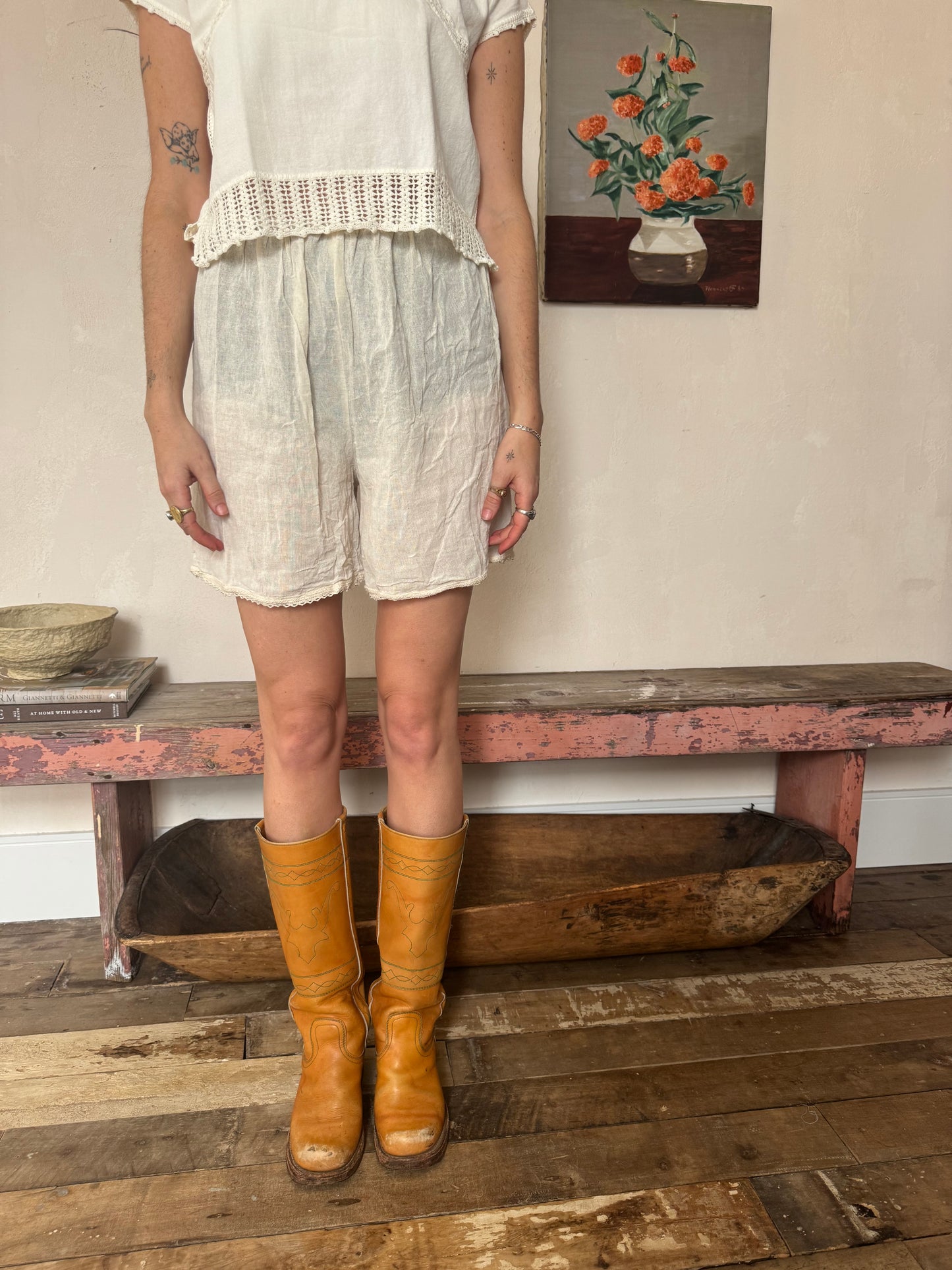 Lightweight natural gauze cotton with an elastic waistband and little crochet trim detail!
