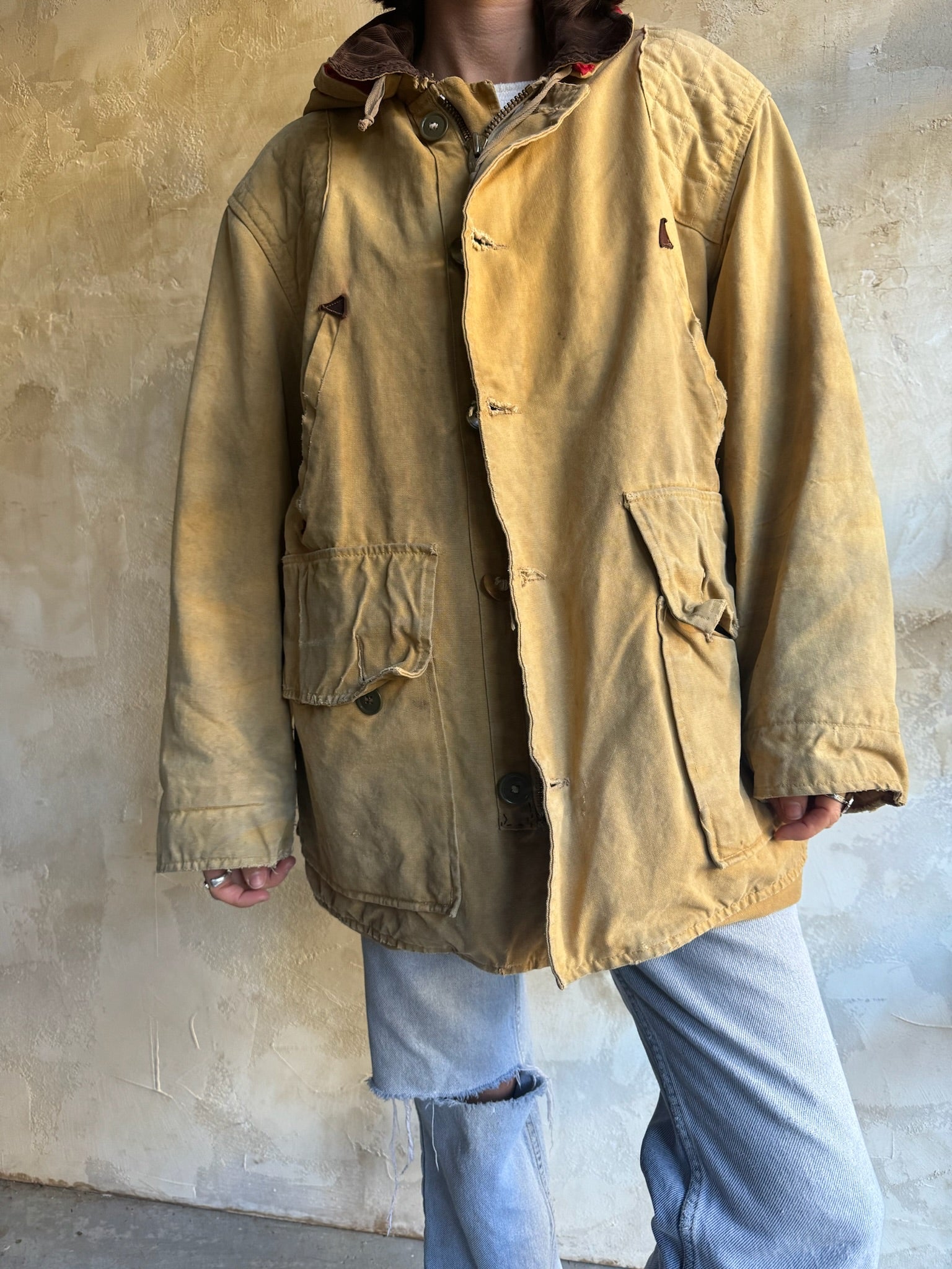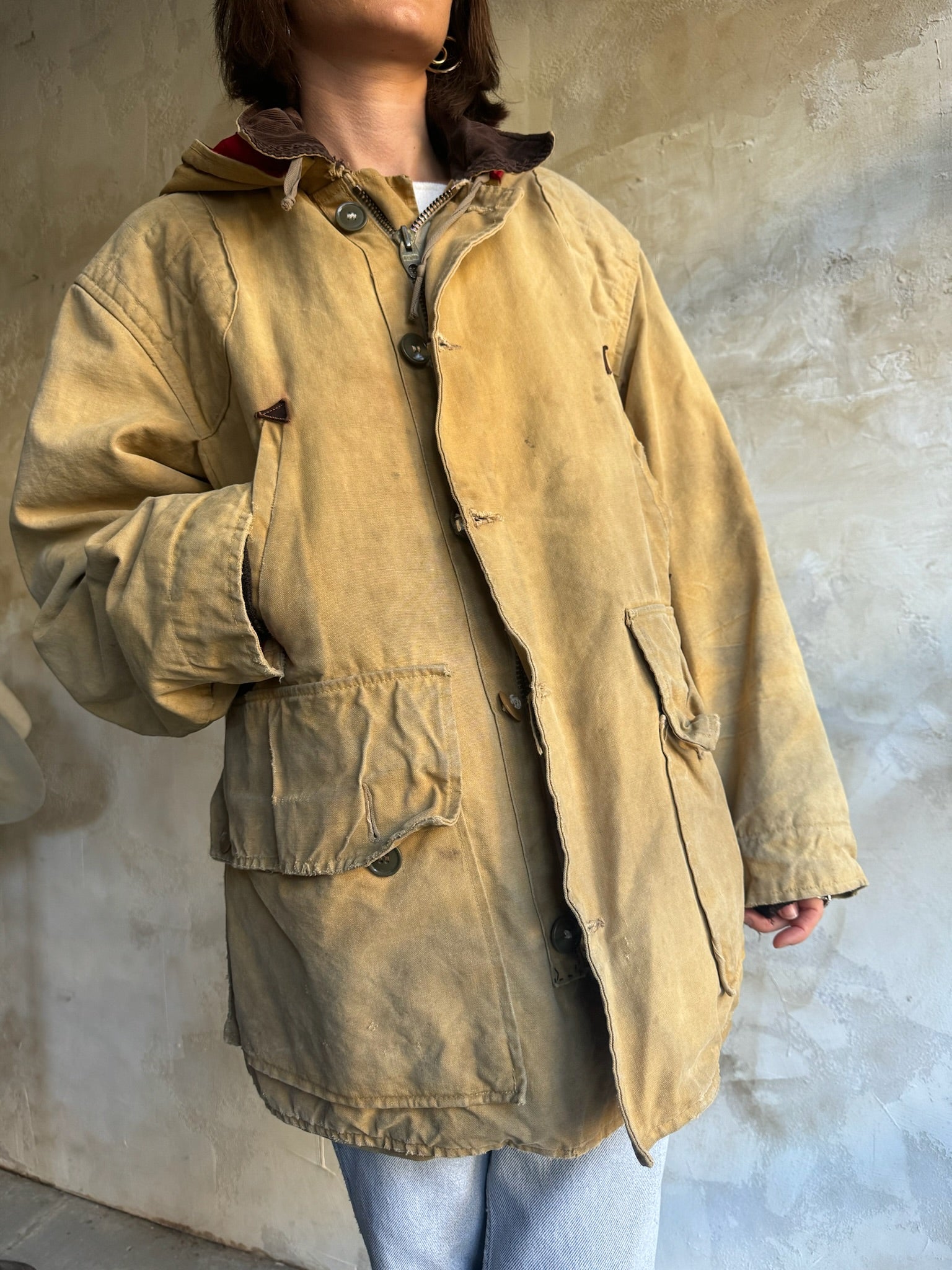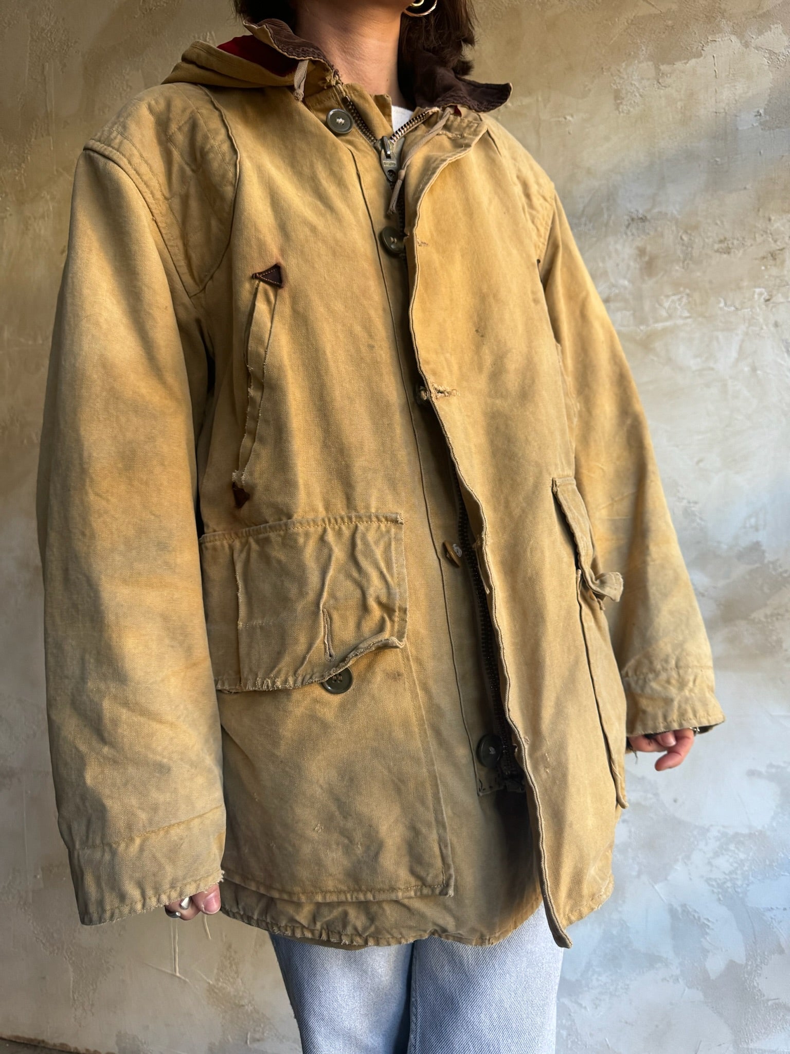 Old hunting + fishing jacket with red quilted lining, industrial zipper and removable hood. Jacket has both zipper and button closures. Brown corduroy collar. Missing buttons on the pockets! Made in Canada.