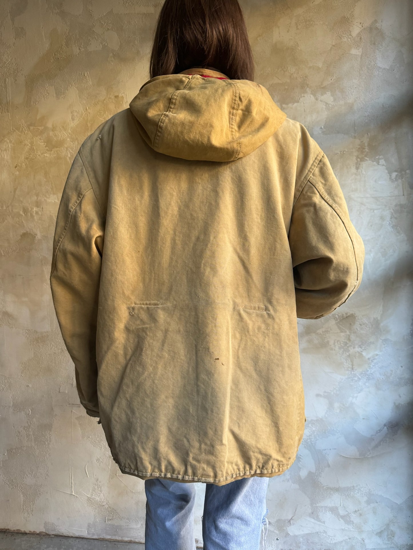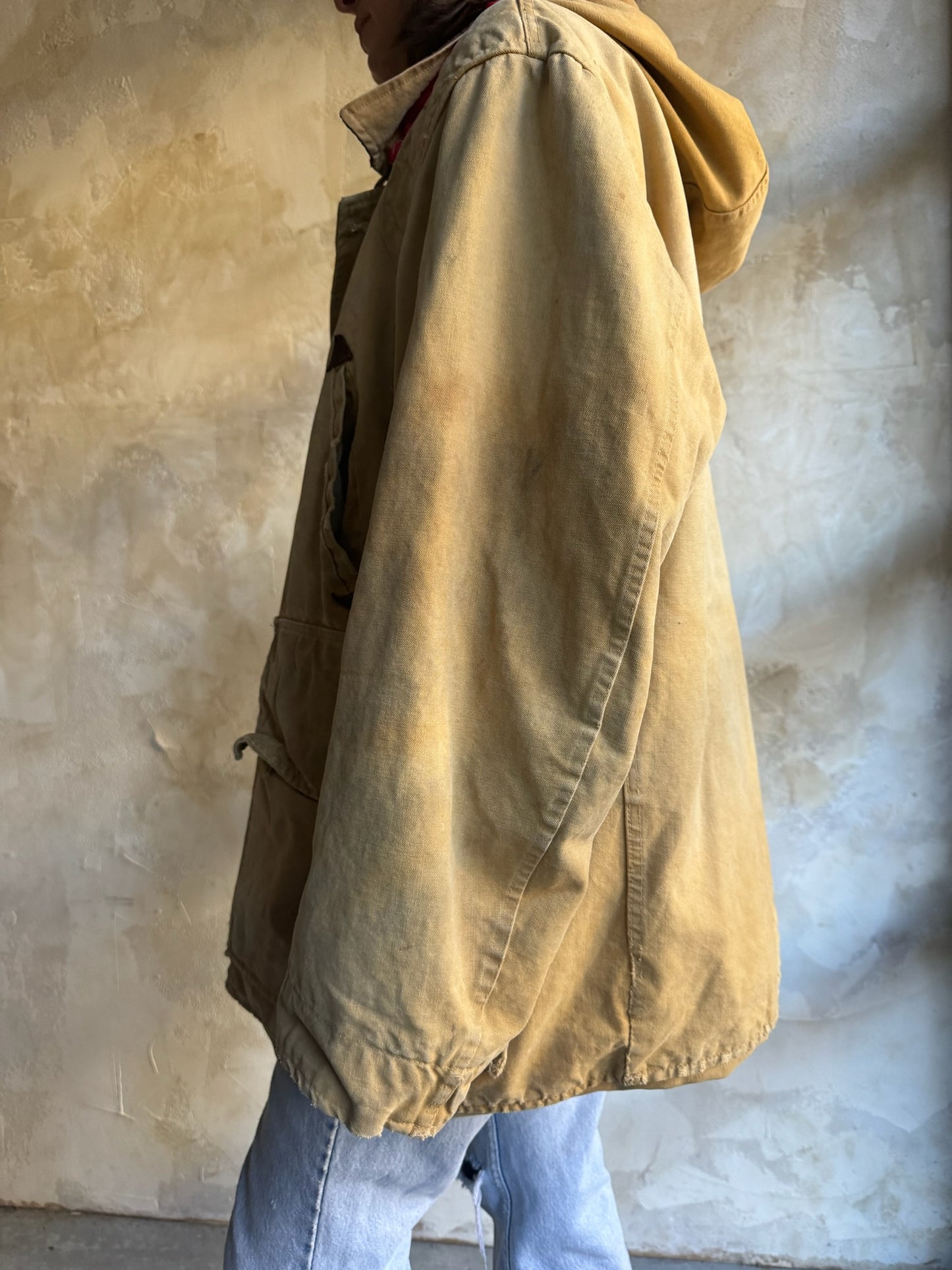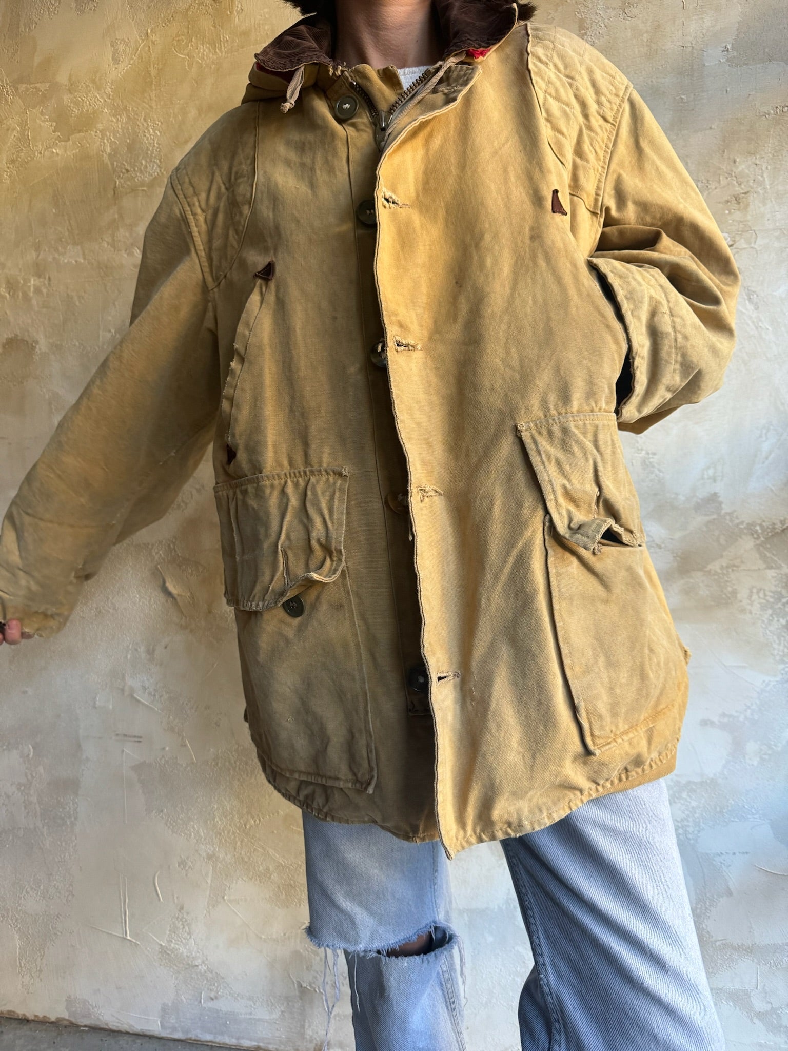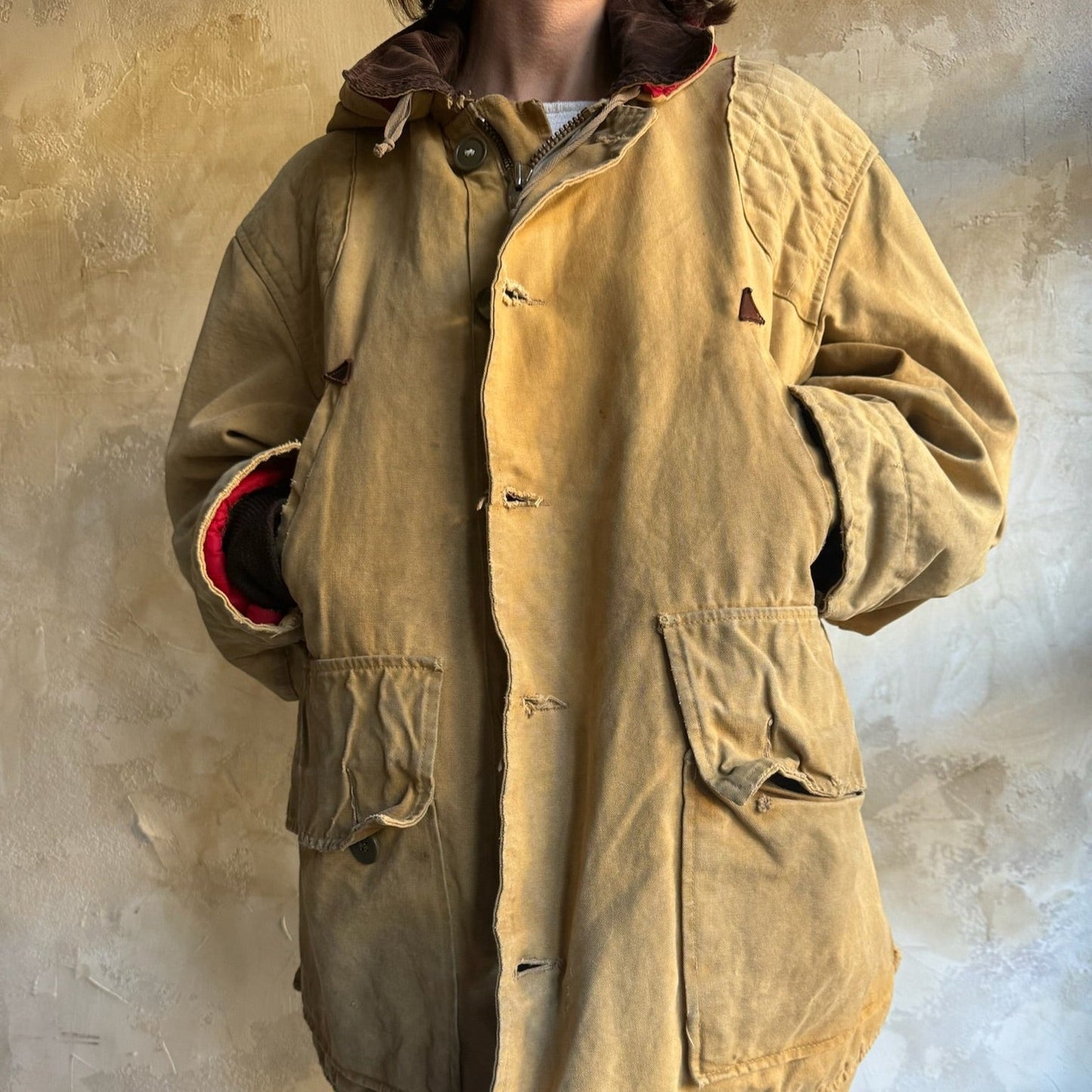 Old hunting + fishing jacket with red quilted lining, industrial zipper and removable hood. Jacket has both zipper and button closures. Brown corduroy collar. Missing buttons on the pockets! Made in Canada.