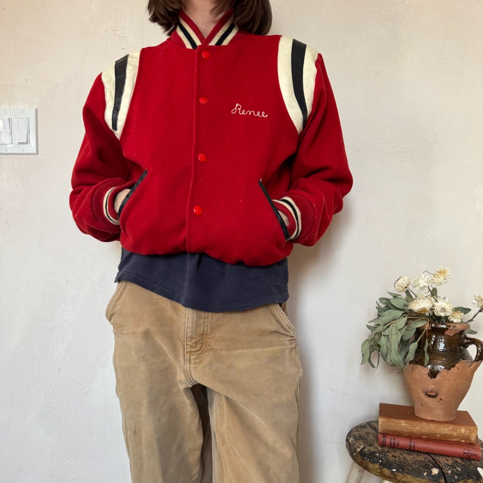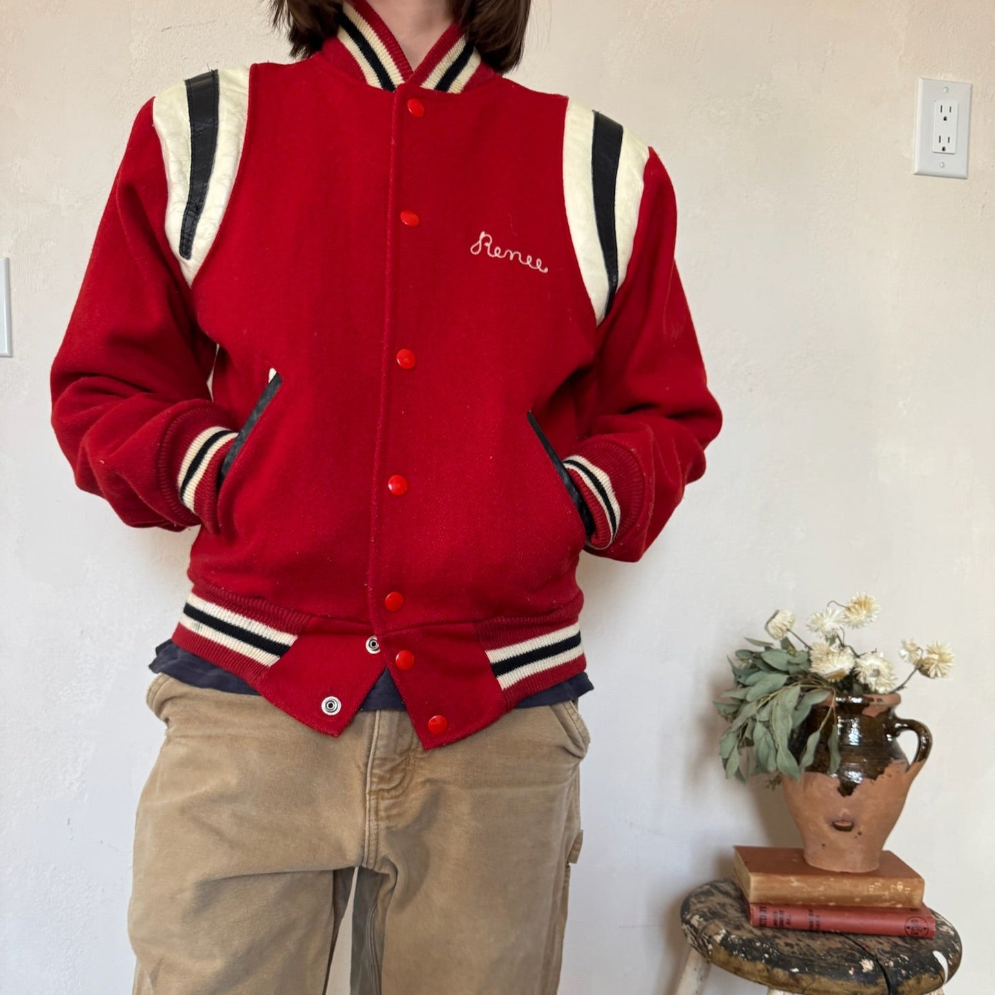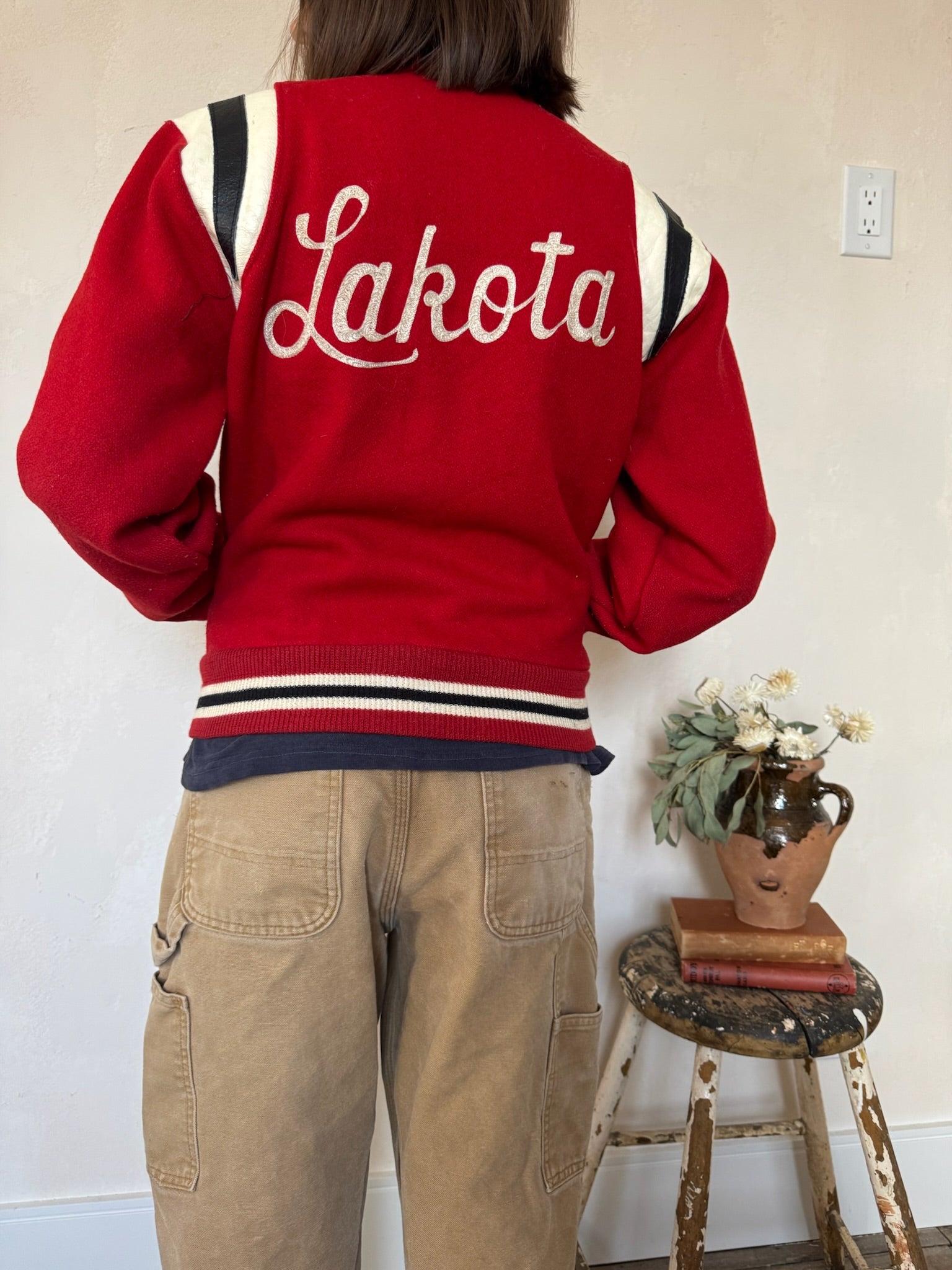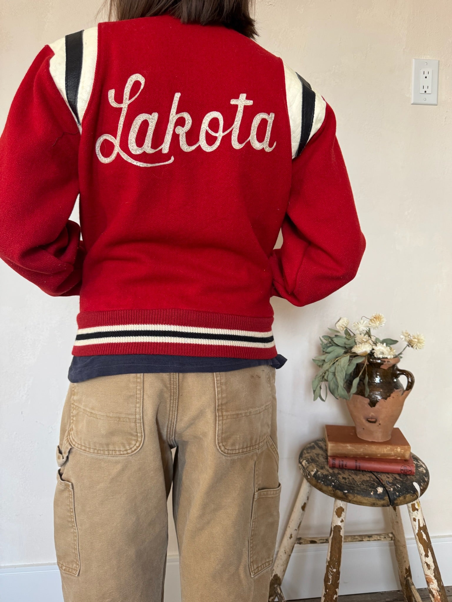 Renee’s cherry red + cream + black varsity jacket. Back stitched 'Lakota'.