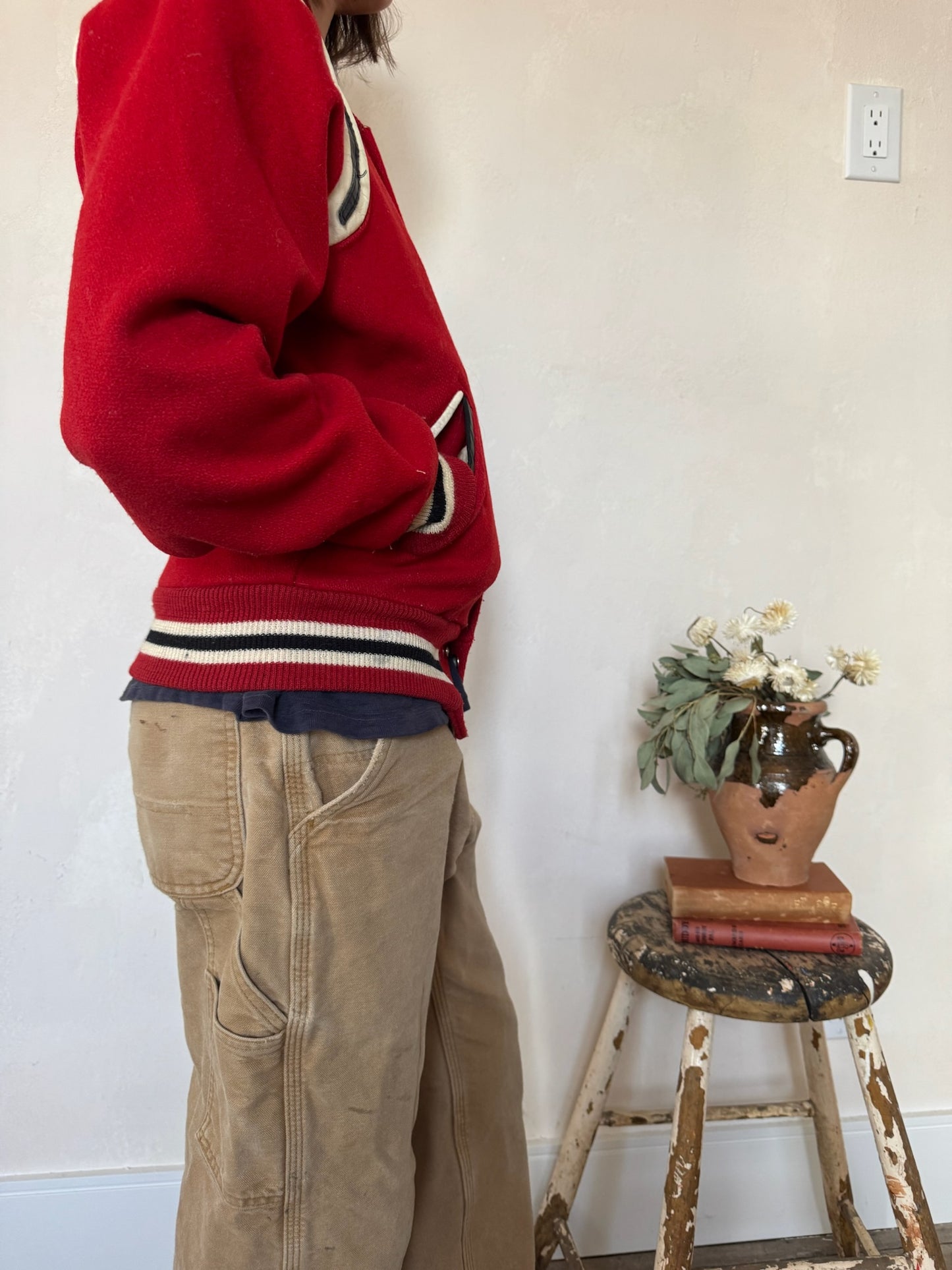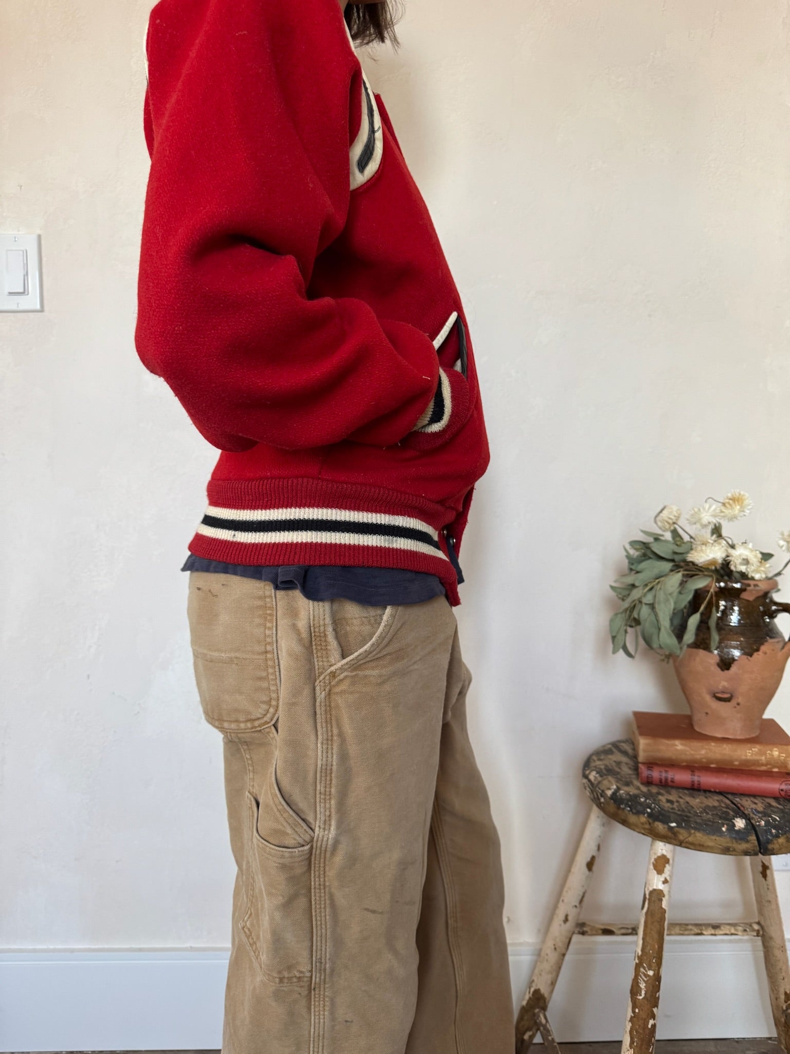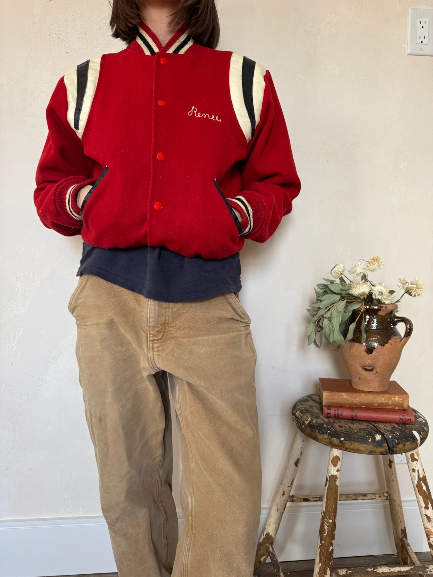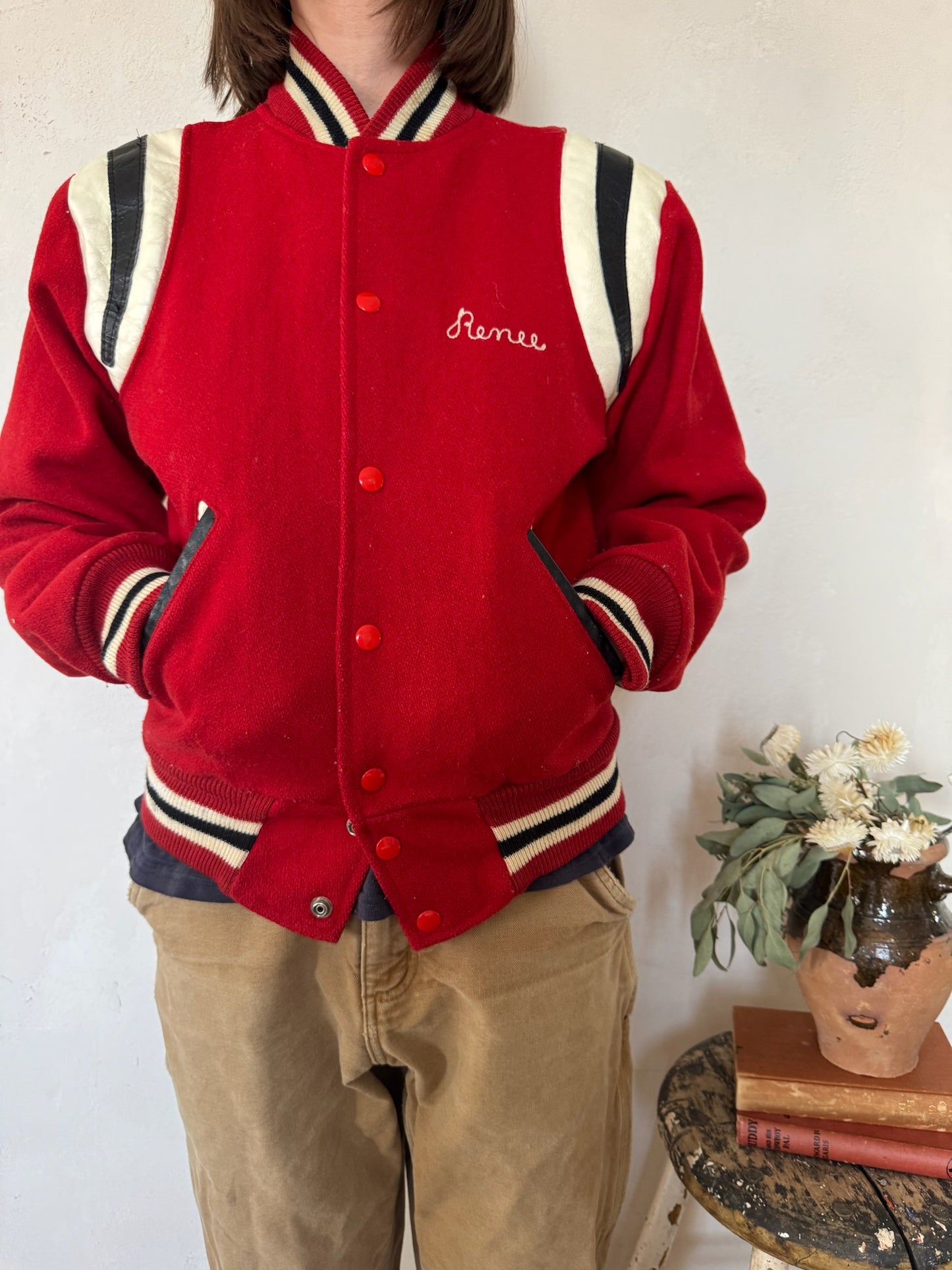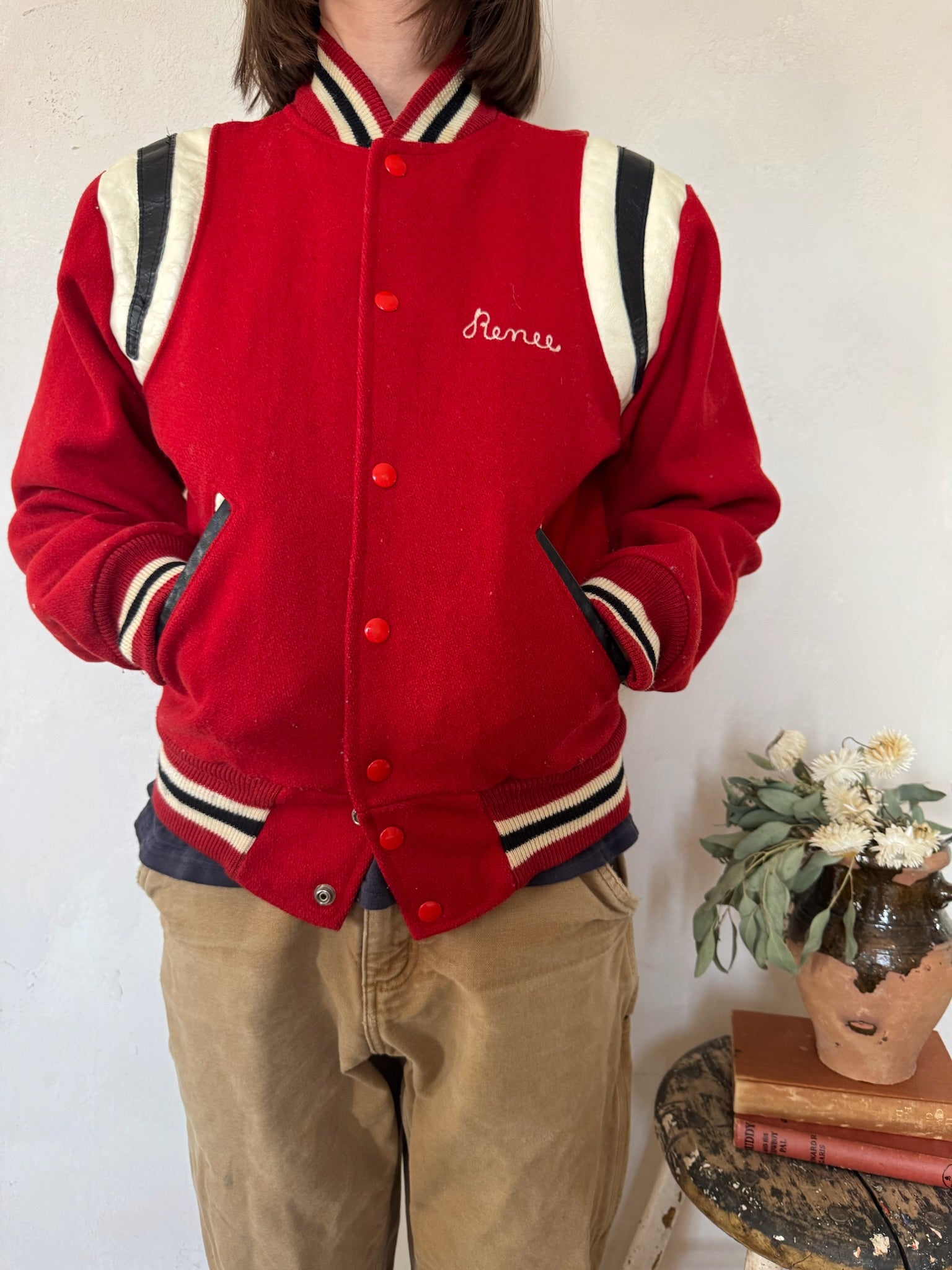 Renee’s cherry red + cream + black varsity jacket. Back stitched 'Lakota'.