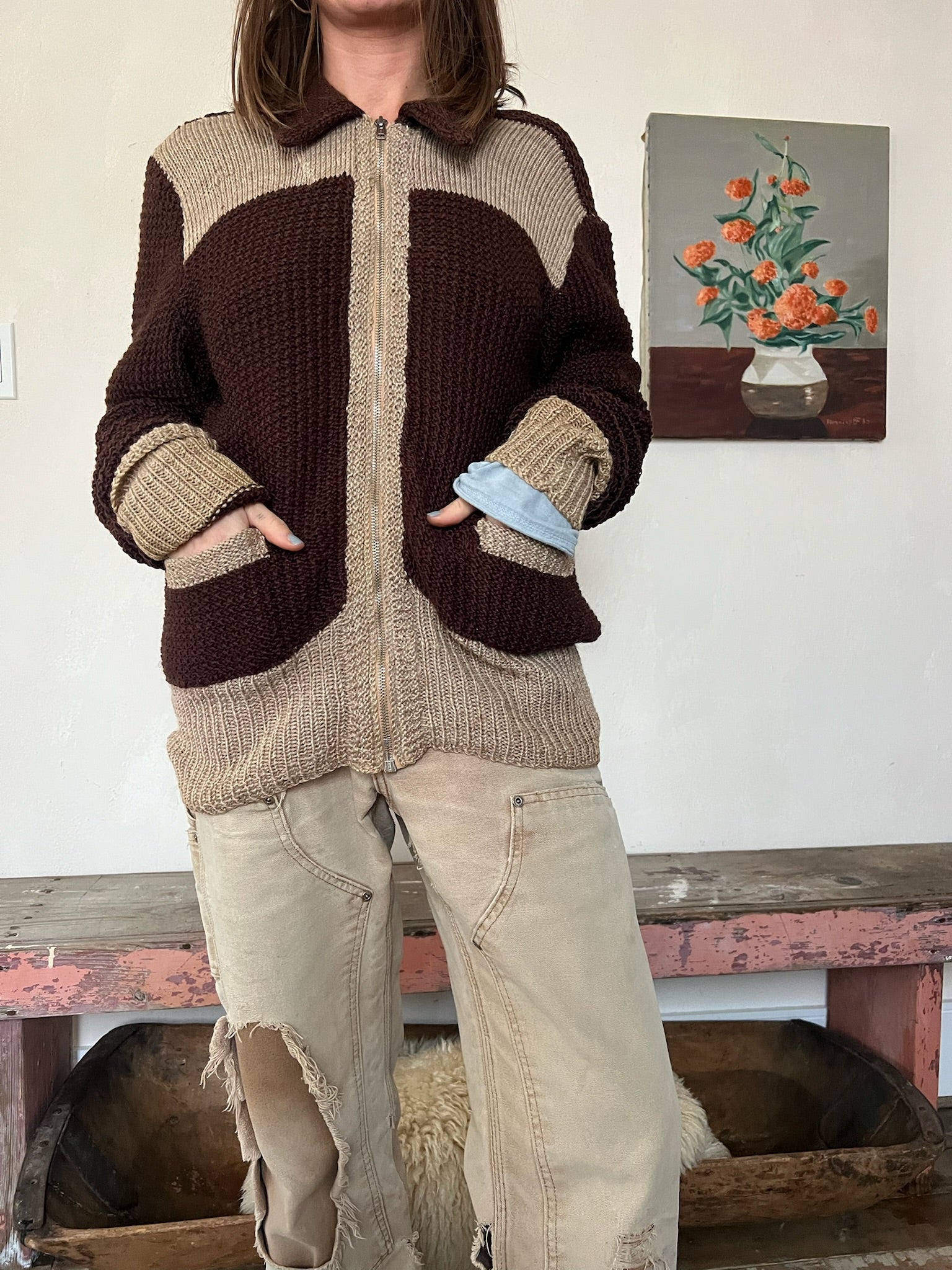 A quirky slouchy fit! Has really long arms! Metal zipper.