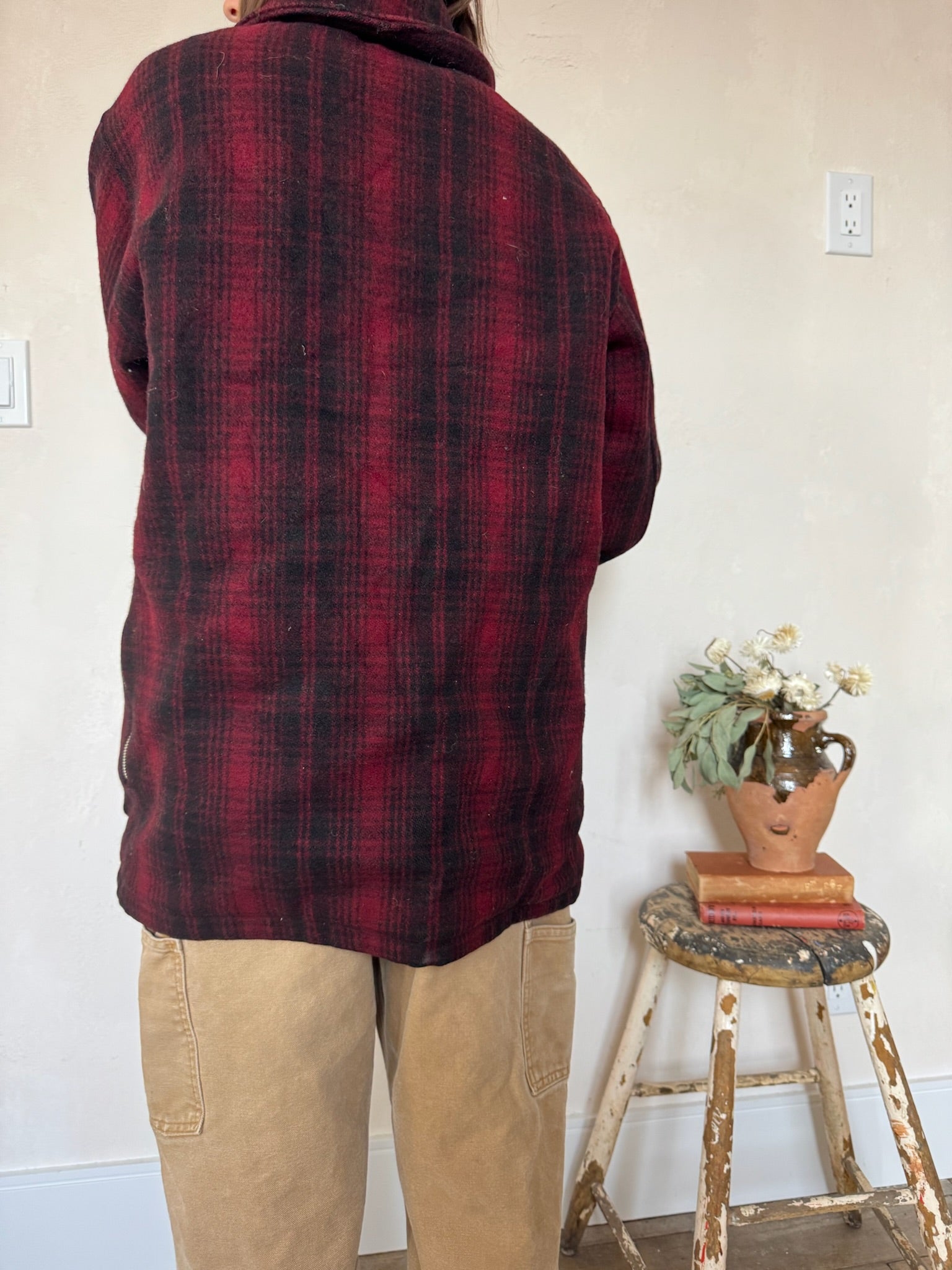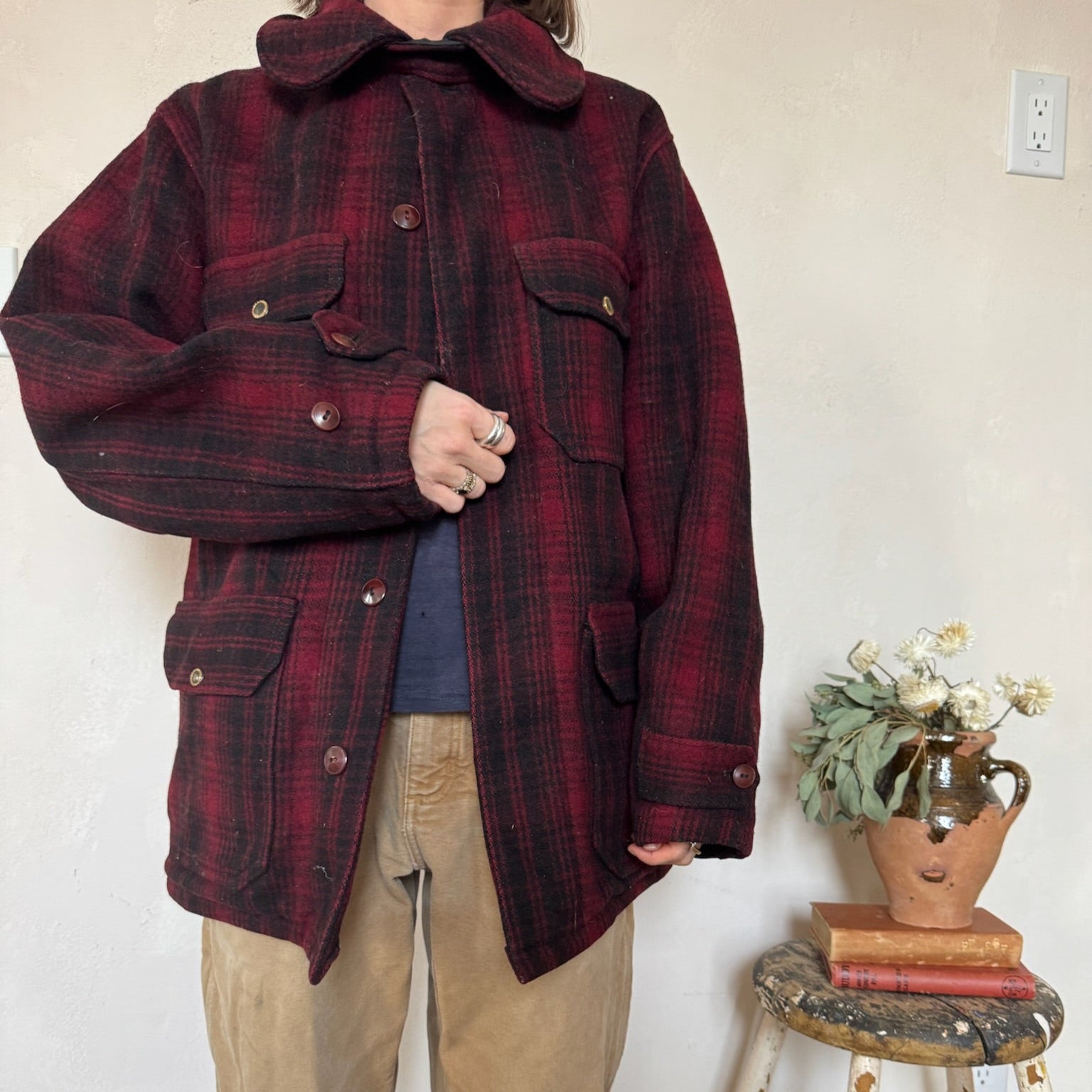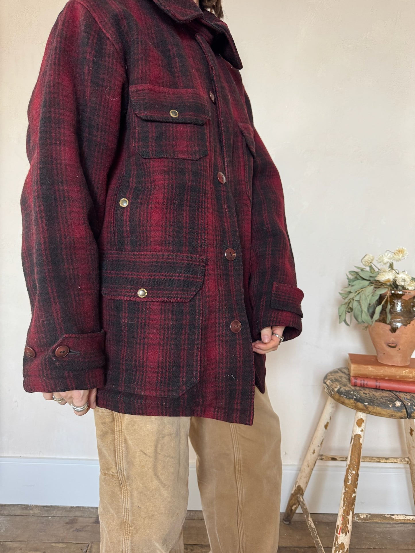 Dark red and black plaid Woolrich jacket! Love the Peter Pan collar and button-up details!