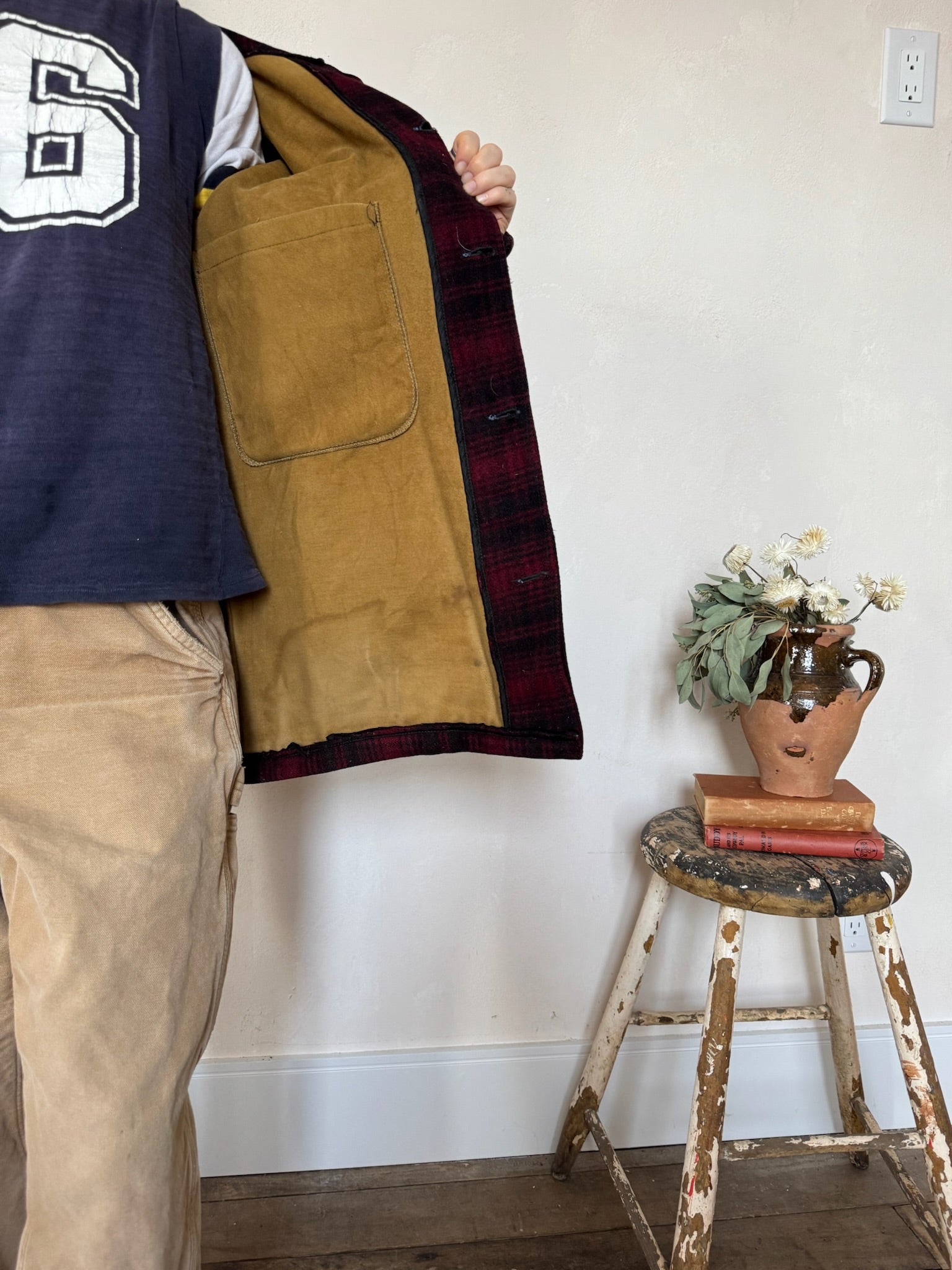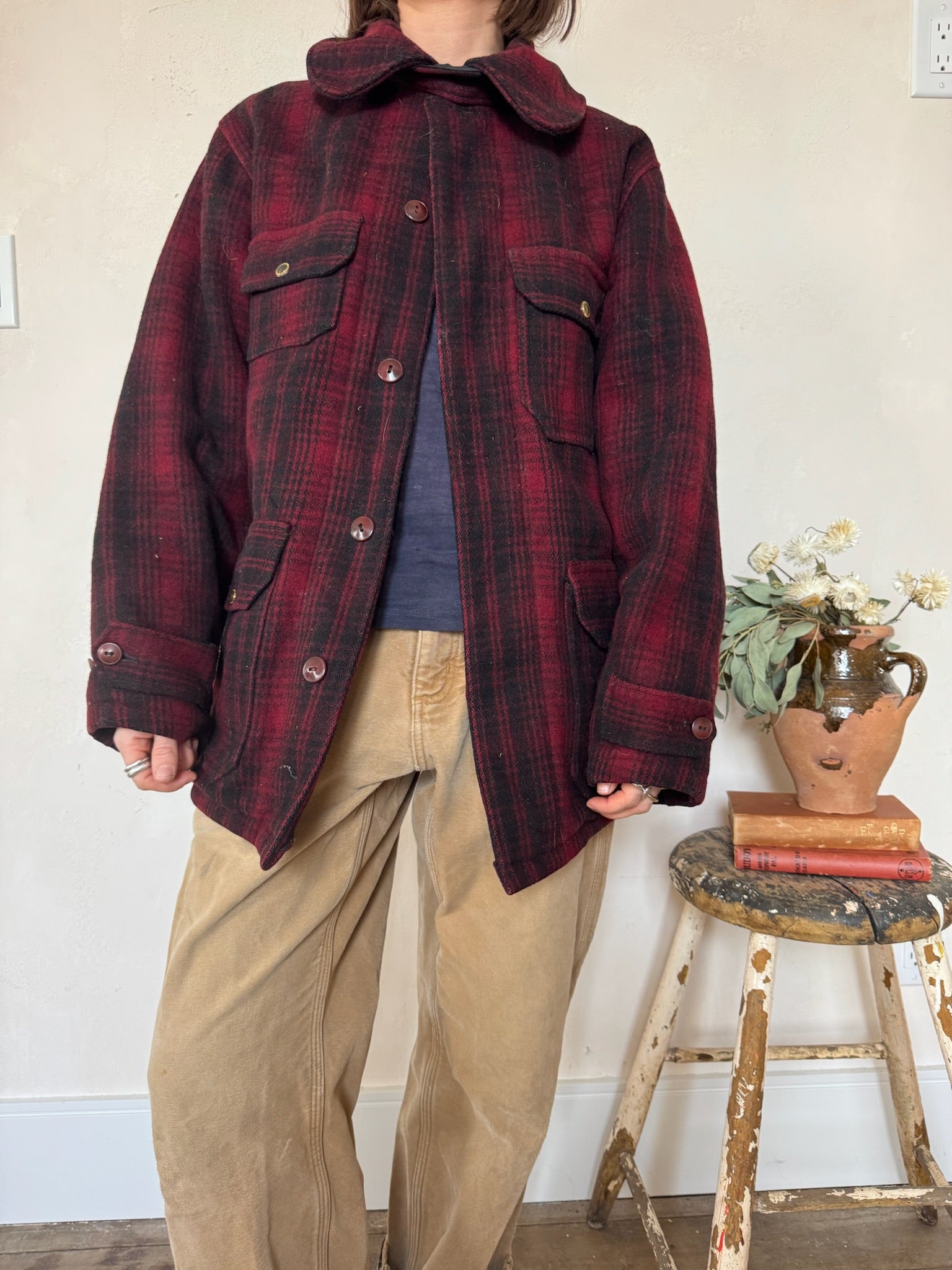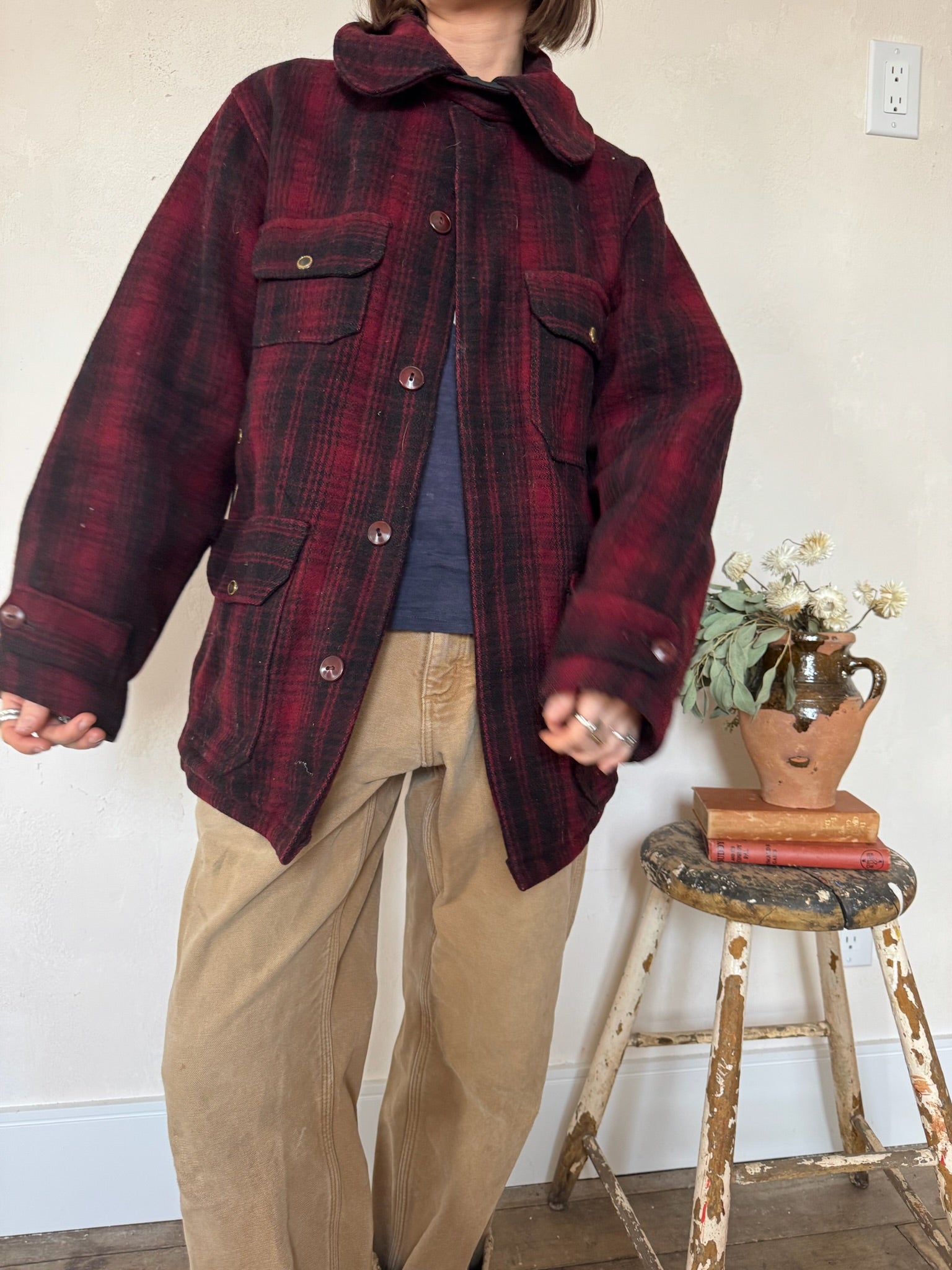 Dark red and black plaid Woolrich jacket! Love the Peter Pan collar and button-up details!